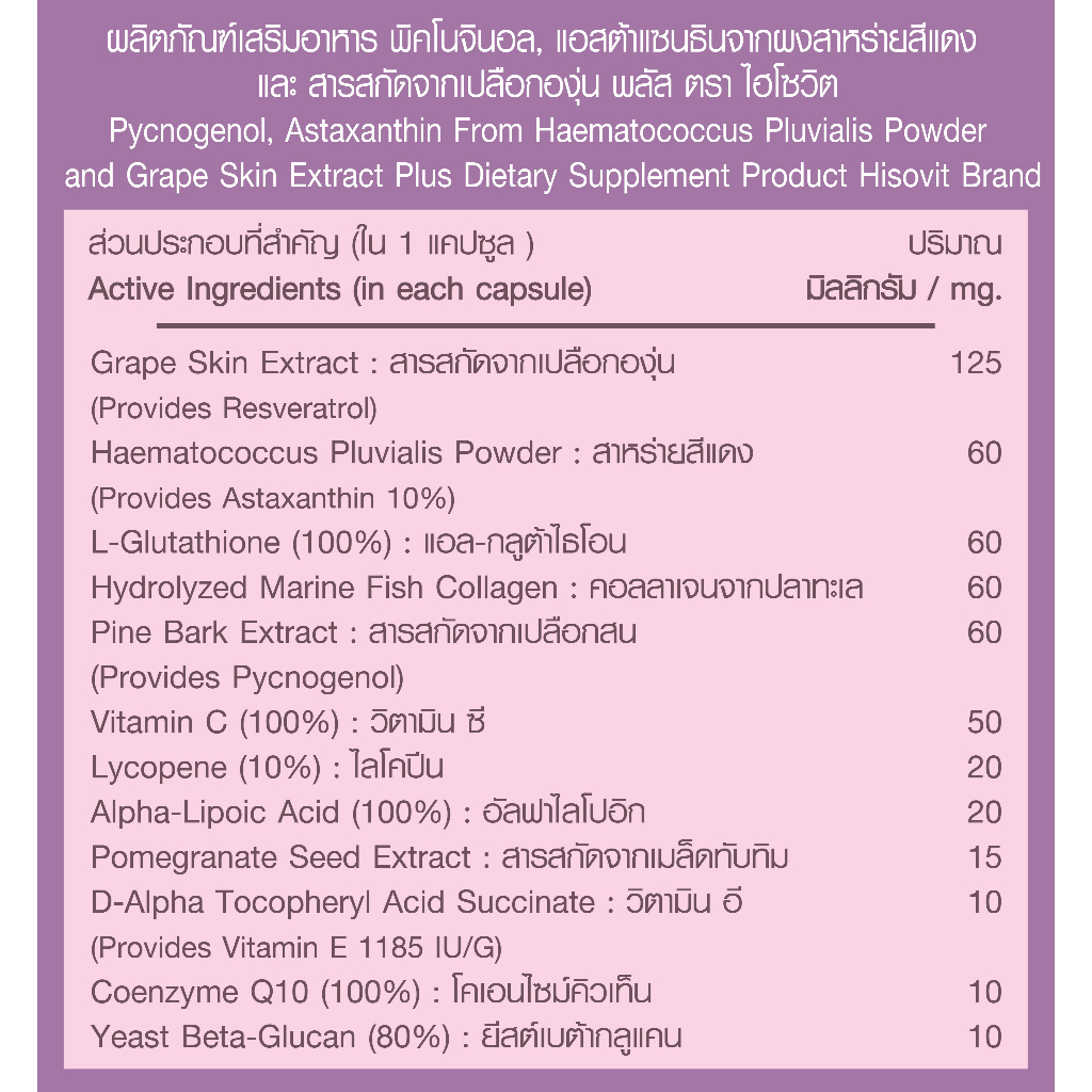HISOVIT สารสกัดจากเปลือกสนฝรั่งเศส,แอสต้าแซนธิน, เรสเวอราทรอล 30 แคปซูล