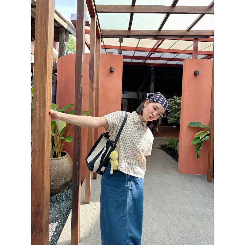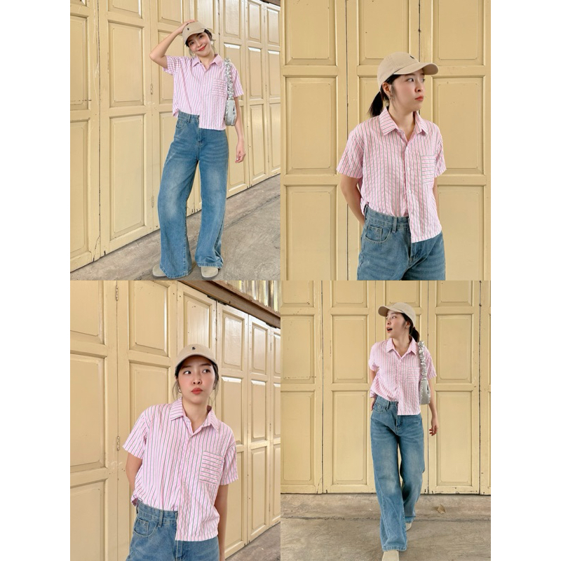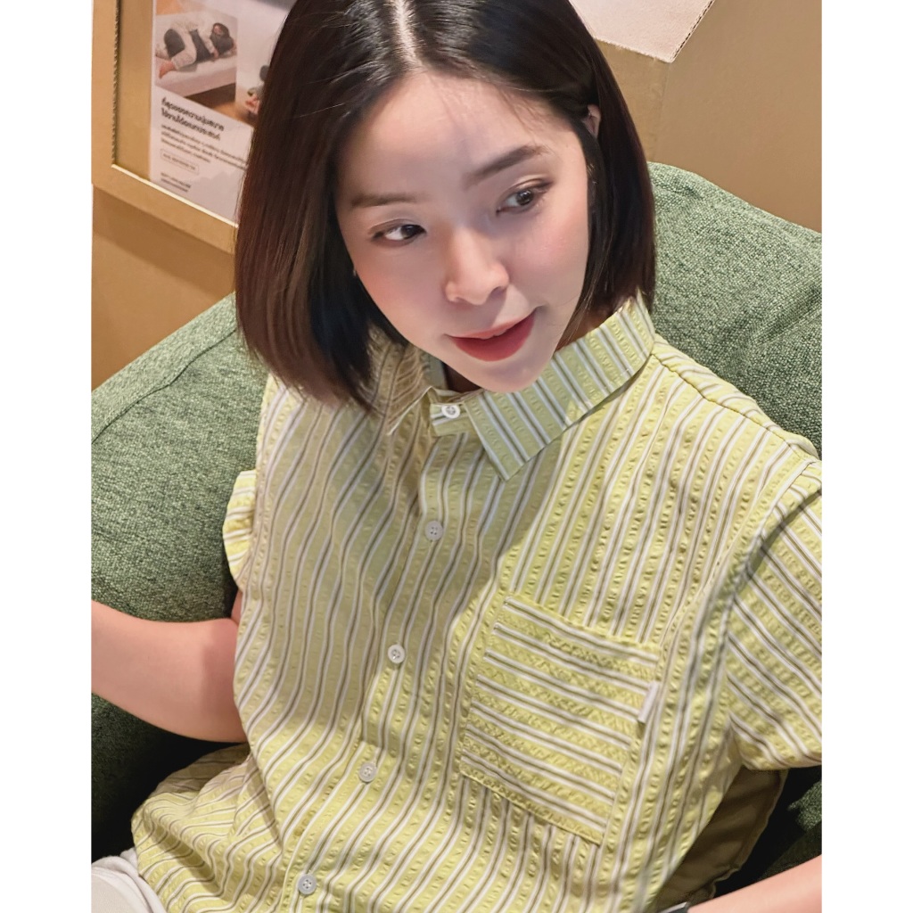 MalaOriginal | Fluffy Crop Shirt เสื้อเชิ้ตครอป ไม่ต้องรีด ลายทาง มีกระเป๋าหน้า