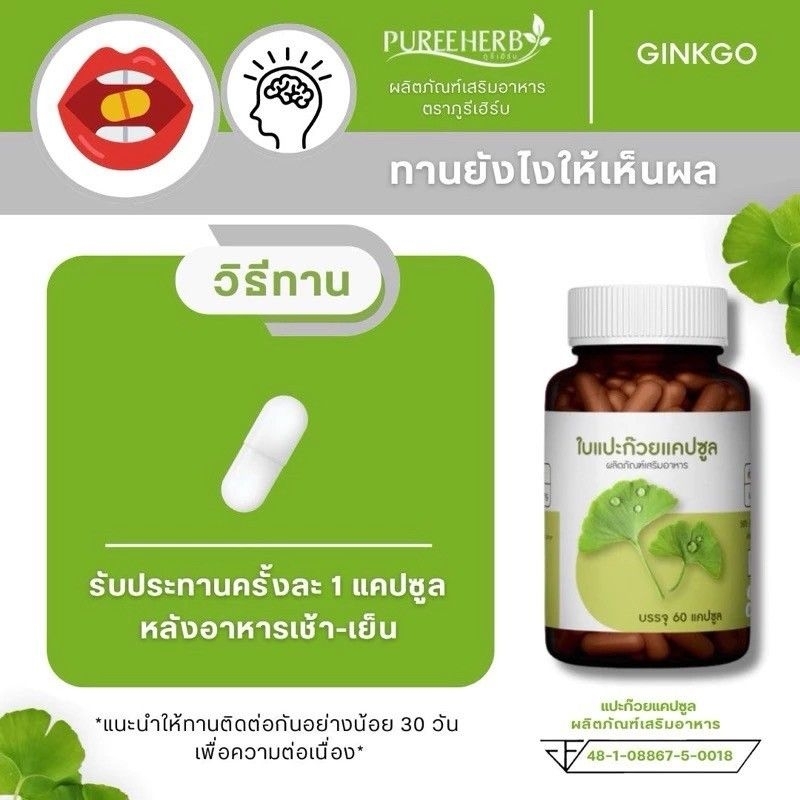 แปะก๊วยแคปซูล ตราภูรีเฮิร์บ 60 แคปซูล - สมอง ความจำ