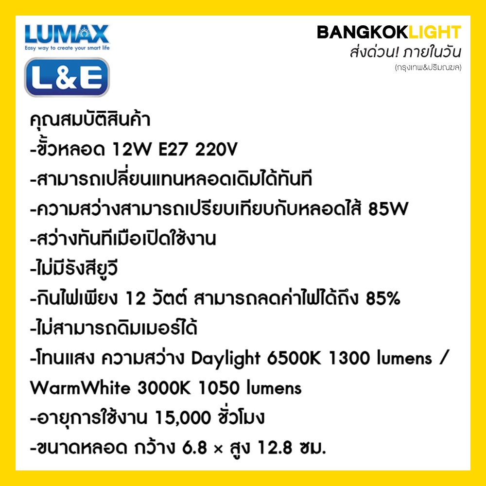 (ส่งด่วนในวัน)หลอดไฟ LUMAX ลูแมกซ์ L&E บับ LED E27 12W (x) (แสงขาว/แสงวอร์มไวท์/คูลไวท์)