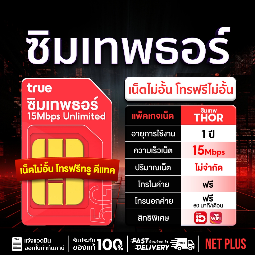 เบอร์สวย (ชุด1) 15Mbps ซิมธอร์ Unlimited ไม่ลดสปีด ซิมเน็ต เทพธอร์ Truemove H เน็ตไม่อั้นไม่จำกัด โทรฟรีทุกค่าย ซิมเทพ