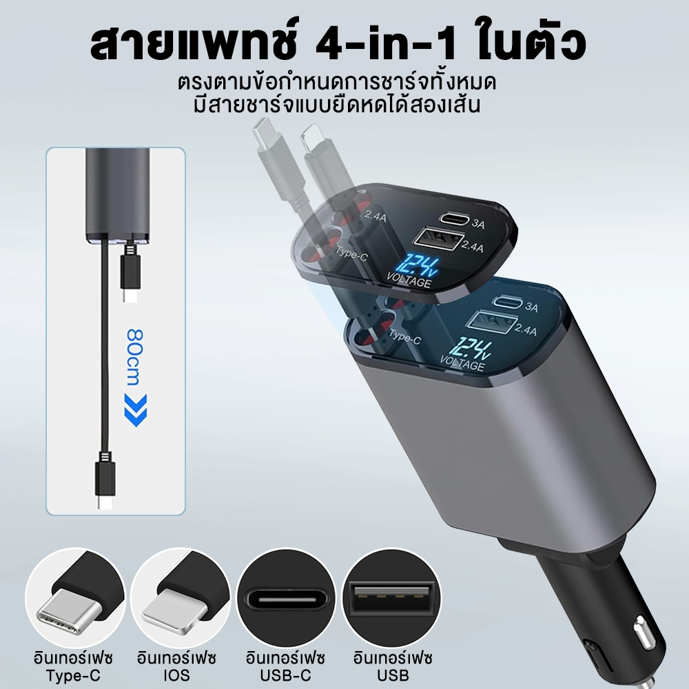 SANSONIC ที่ชาร์จในรถยนต์ หัวชาร์จในรถ 4IN1 120W อะแดปเตอร์ สายชาร์จในรถยนต์ ชาร์จ Lightning Type-C ยืดได้ เก็บอัตโนมัติ