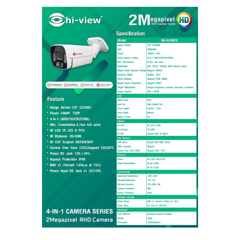 Hi-View กล้องวงจรปิด รุ่น HA-624B20 | ความละเอียด 2MP | ระบบ 4 in 1 (AHD/TVI/CVI/CVBS)