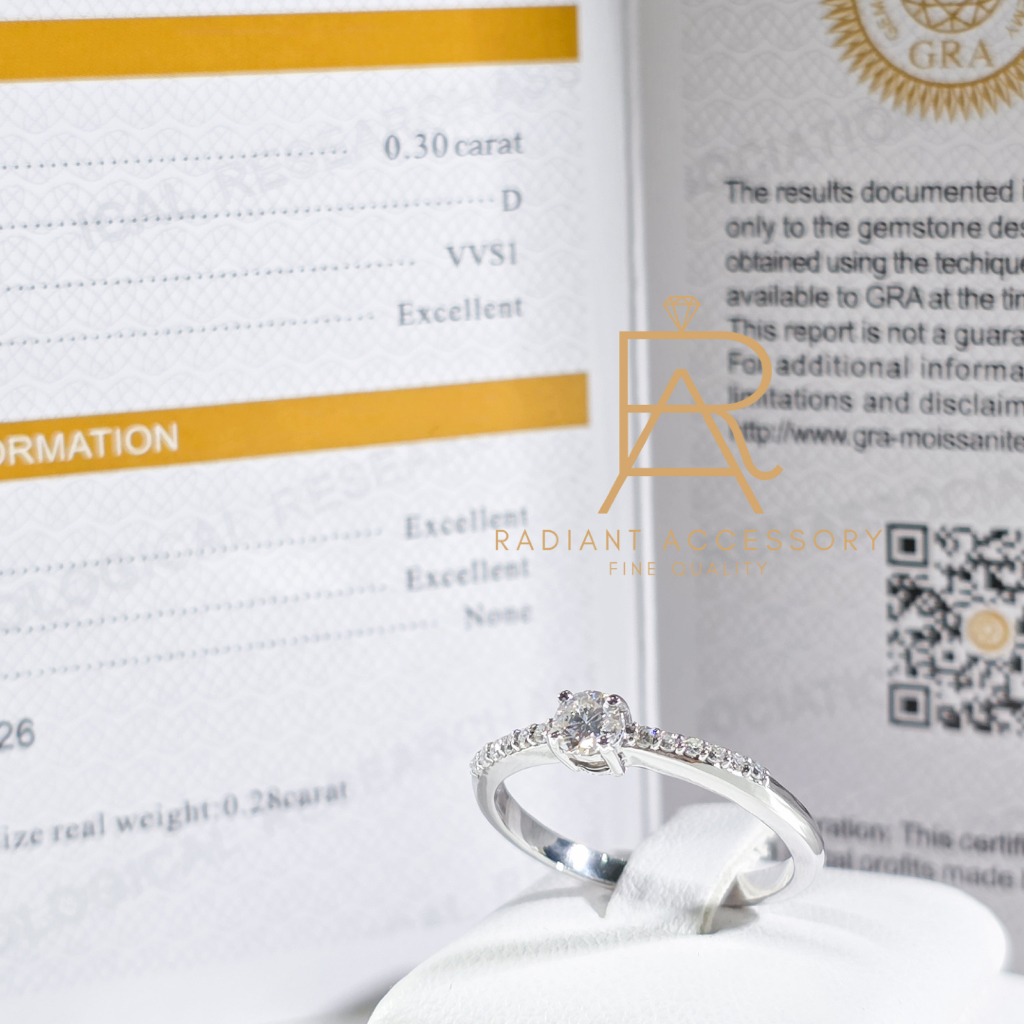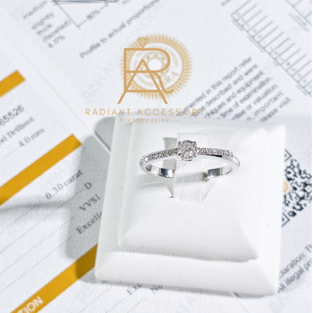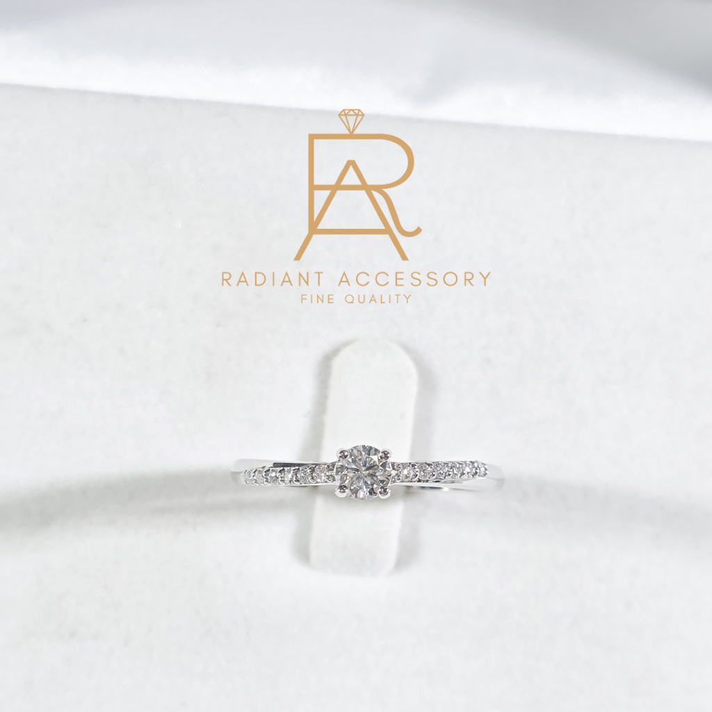 แหวนเงินแท้เม็ดชูฝังเพชร Moissanite 0.3 กะรัต ทรงกลม ฝังบ่าข้างชุบทองคำขาว