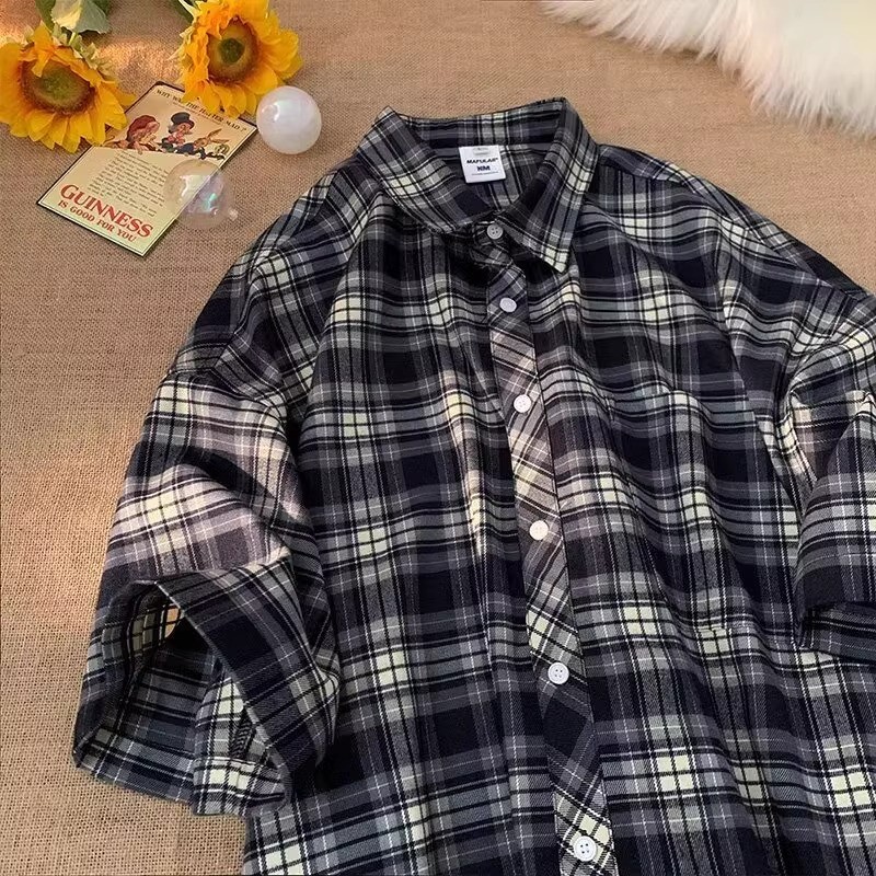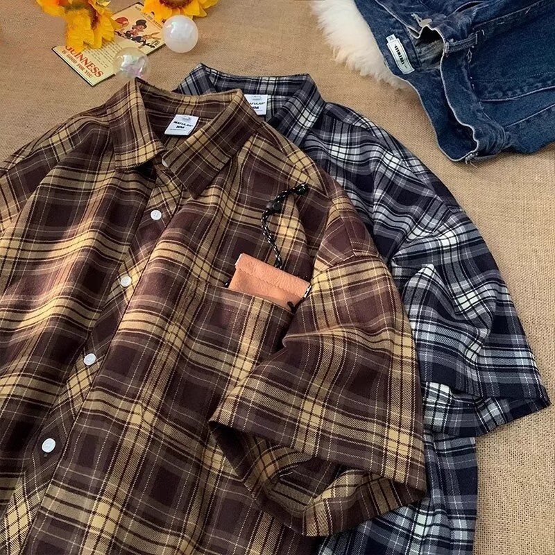 เสื้อเชิ้ตแขนสั้นลําลอง ทรงหลวม ลายสก๊อต แฟชั่นฤดูร้อน สไตล์ฮ่องกง สําหรับผู้ชาย