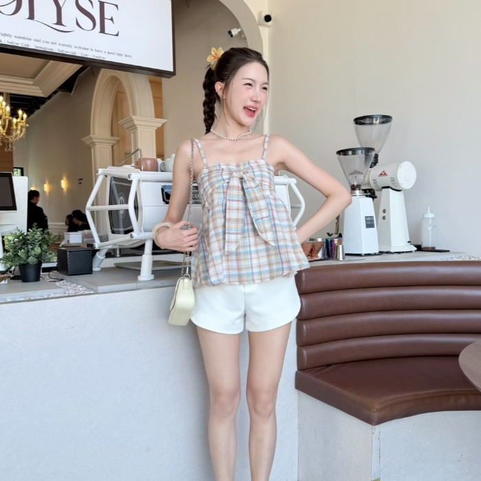 ppitchy.shop 🩷 Baby Ribbon Top - สายเดี่ยวลายสก็อต โบว์ผูกด้านหน้า มี 2 สี