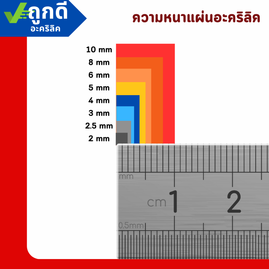 แผ่นอะคริลิค SIZE 40 x 122 cm. หนา 2–10 mm มีสีใส ขาว ขาวขุ่น ดำ แดง น้ำเงิน เขียว ดำใส - P40122