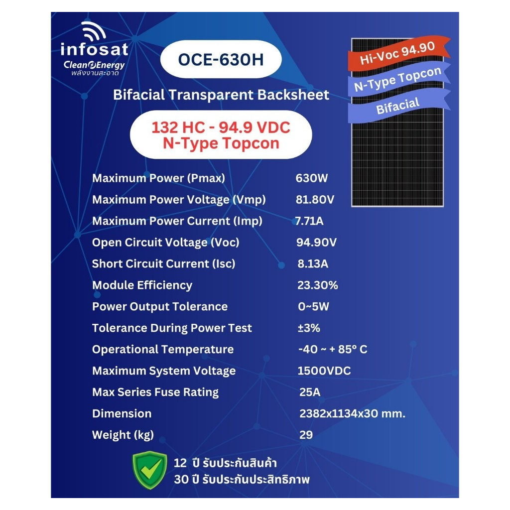 แผงโซลาร์เซลล์ Mono 630W HI-VOC Bifacial N-Type