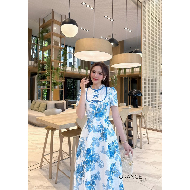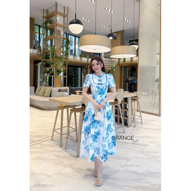 🧡พร้อมส่ง S-2XL🧡ป้าย Orange Juice💕เดรสยาว พิมพ์ลายดอกไม้สีฟ้า สวยหวาน แต่งโบว์ระบายอก