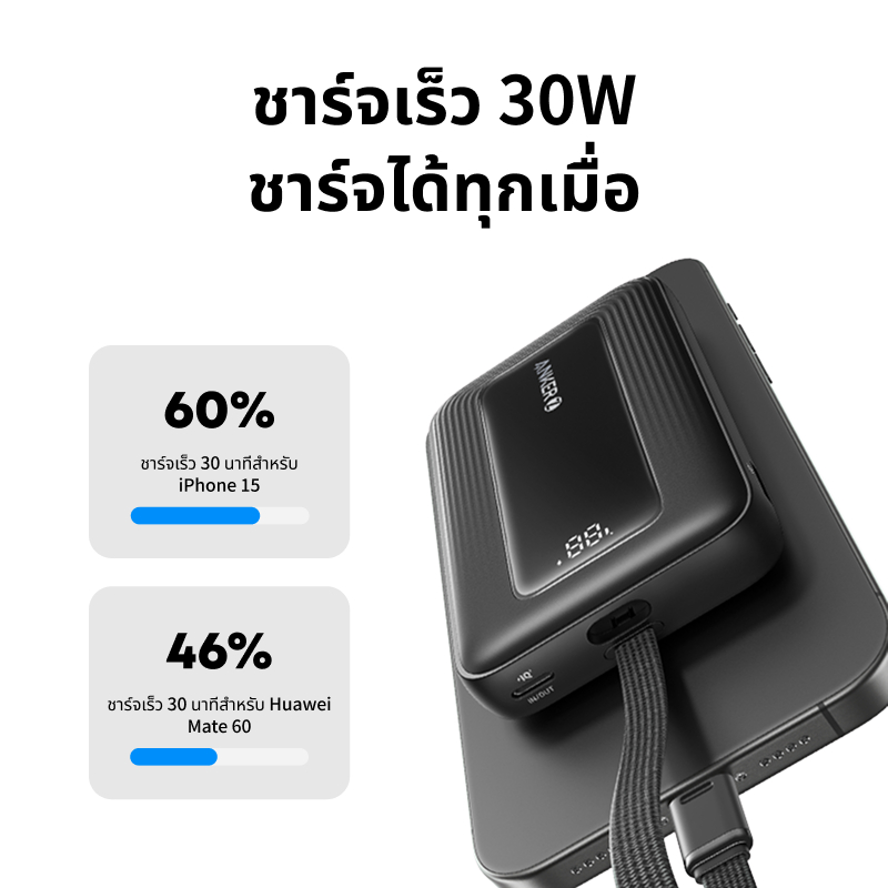 ANKER Zolo Power Bank 20,000mAh/10,000mAh|ชาร์จเร็ว PD30W| พาวเวอร์แบงค์'แบดตสํารองมีขาปลั๊กสายในตัว| for iPhone 17/16/15/iPad MacBook