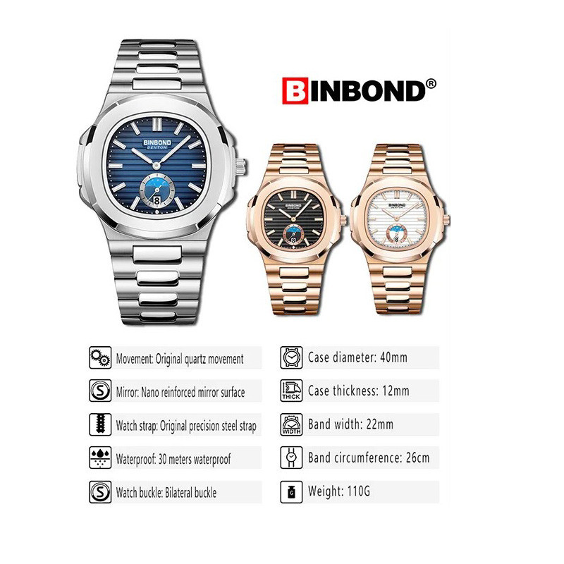 BINBOND หรูหราสบาย ๆ สแควร์สแตนเลสปฏิทินไฟกลางคืนกันน้ำผู้ชายนาฬิกาควอตซ์