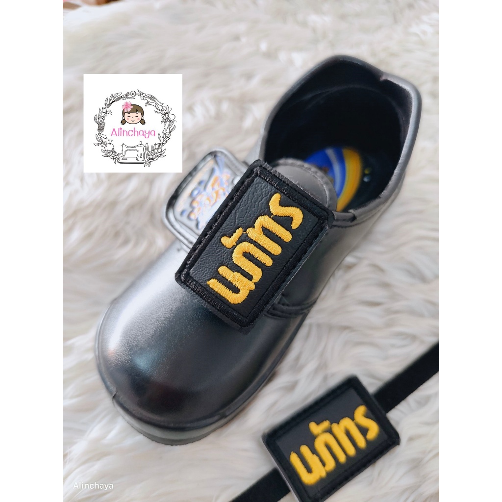 ป้ายหนังปักชื่อแบบติดด้านข้าง มีสายตีนตุ๊กแก ติดรองเท้านักเรียนอนุบาลชายแจ้งชื่อทางแชท