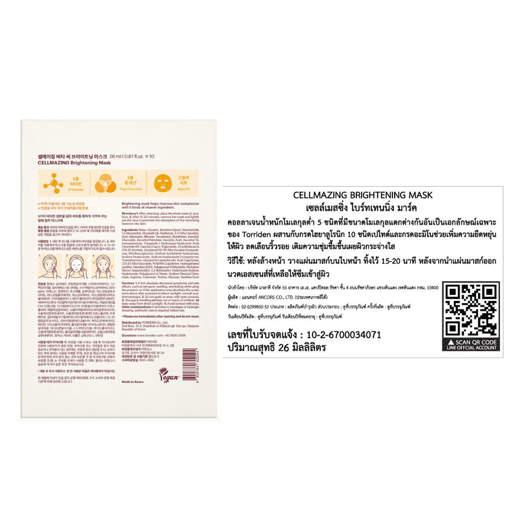 Torriden ทอร์ริเดน มาร์ค ไบรท์เทนนิ่ง เซลล์เมสซิ่ง 1 แผ่น