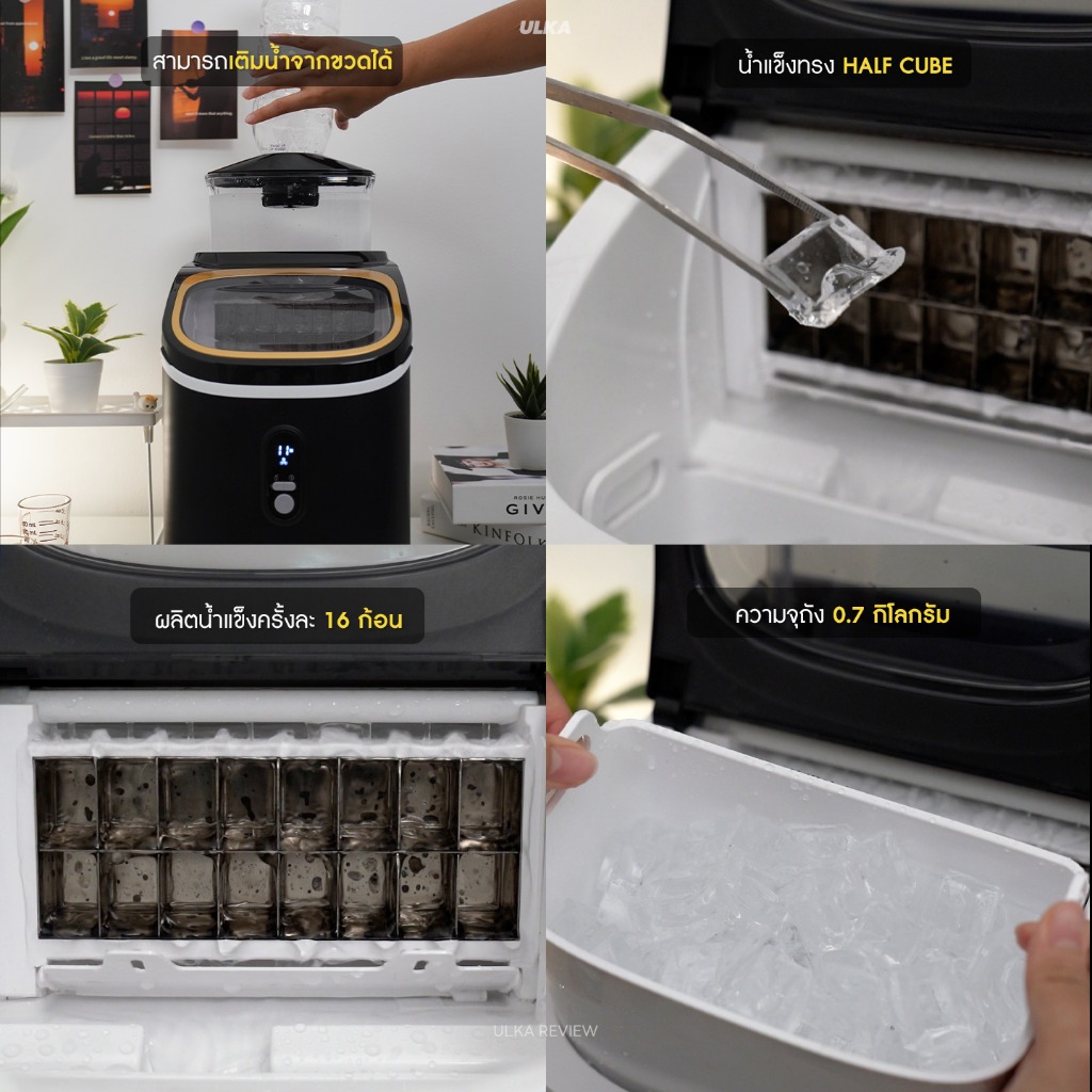 เครื่องทำน้ำแข็ง ทรง HalfCube รุ่น ULKA-15AF สำหรับครอบครัวเล็ก 16 ก้อน/15 kg รองรับการใส่น้ำจากขวด/แทงก์ ไม่ต้องเดินท่อ