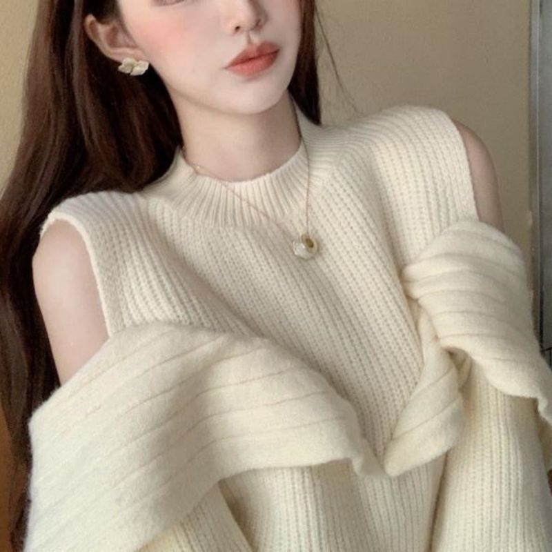 ZHELIHANGFEI เสื้อสเวตเตอร์ถักไหล่เปลือยคอสูงปานกลางหลวมไปกับทุกสิ่ง