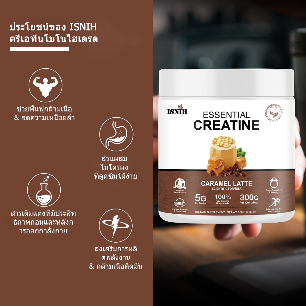 ISNIH Creatine Monohydrate Powder Muscle Growth ครีเอทีน 5000 เพิ่มพลังงานเพื่อการฟื้นตัวที่รวดเร็ว รสคาราเมลลาเต้ 300g