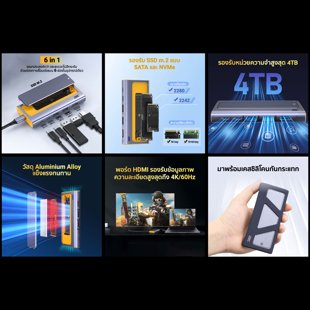 [ลดเหลือ 1439] ZTEC ZD622 6 in 1 USB-C 10Gbps รองรับ M.2 NVMe & SATA , HDMI 4K , USB 3.2 Gen 2 10Gbps -12M