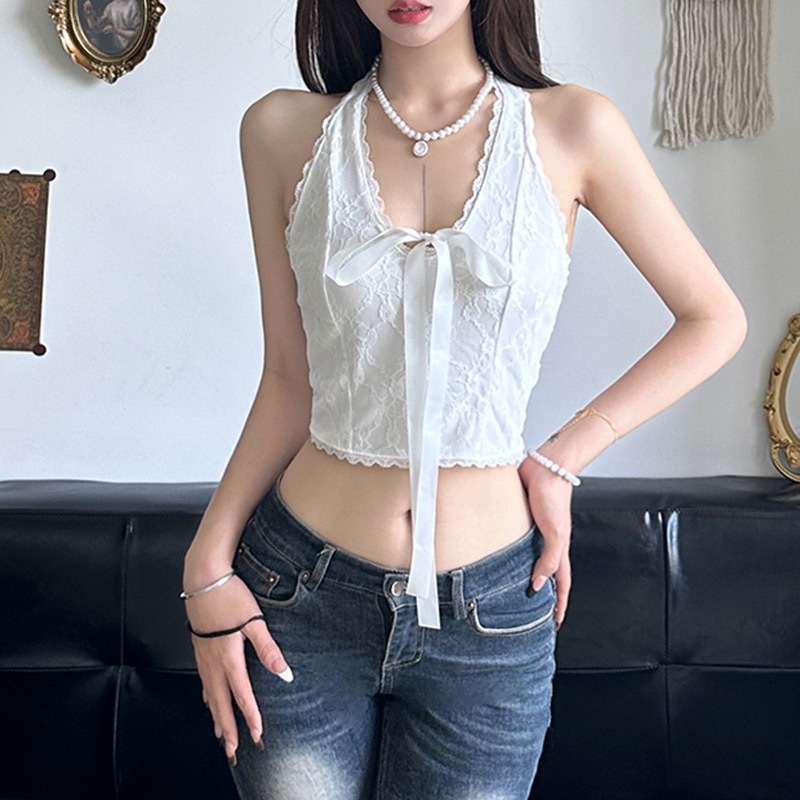 ใหม่โบว์คอวีลูกไม้เชือกแขวนคอเสื้อผู้หญิงฤดูร้อนหวานร้อนแขวนเซ็กซี่เกาะอกด้านบนที่สวยงาม