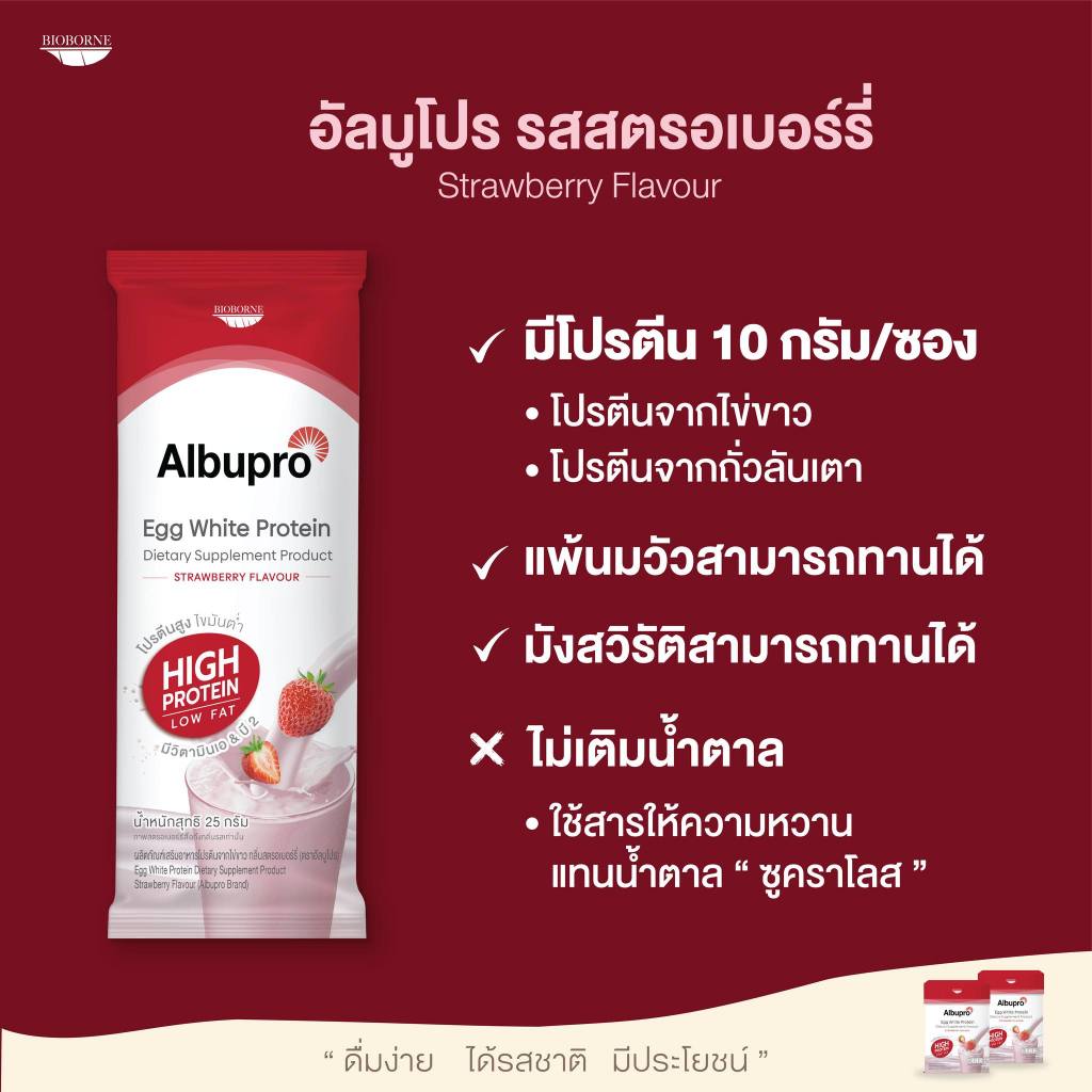 ส่งด่วน!! Albupro Strawberry อัลบูโปรรสสตรอว์เบอร์รี่ โปรตีนจากไข่ขาว กล่องละ 12 ซอง แถมฟรี 1 ซอง