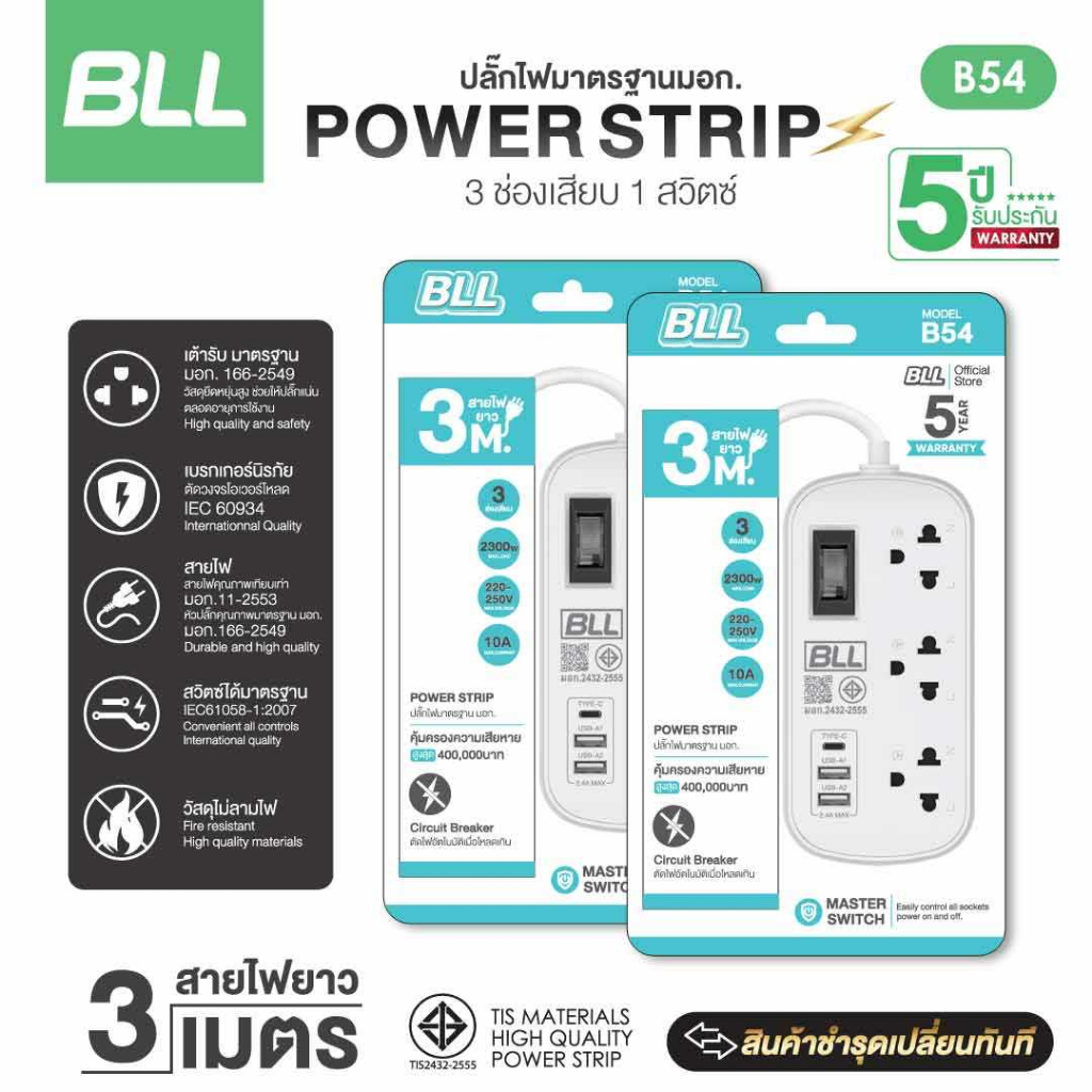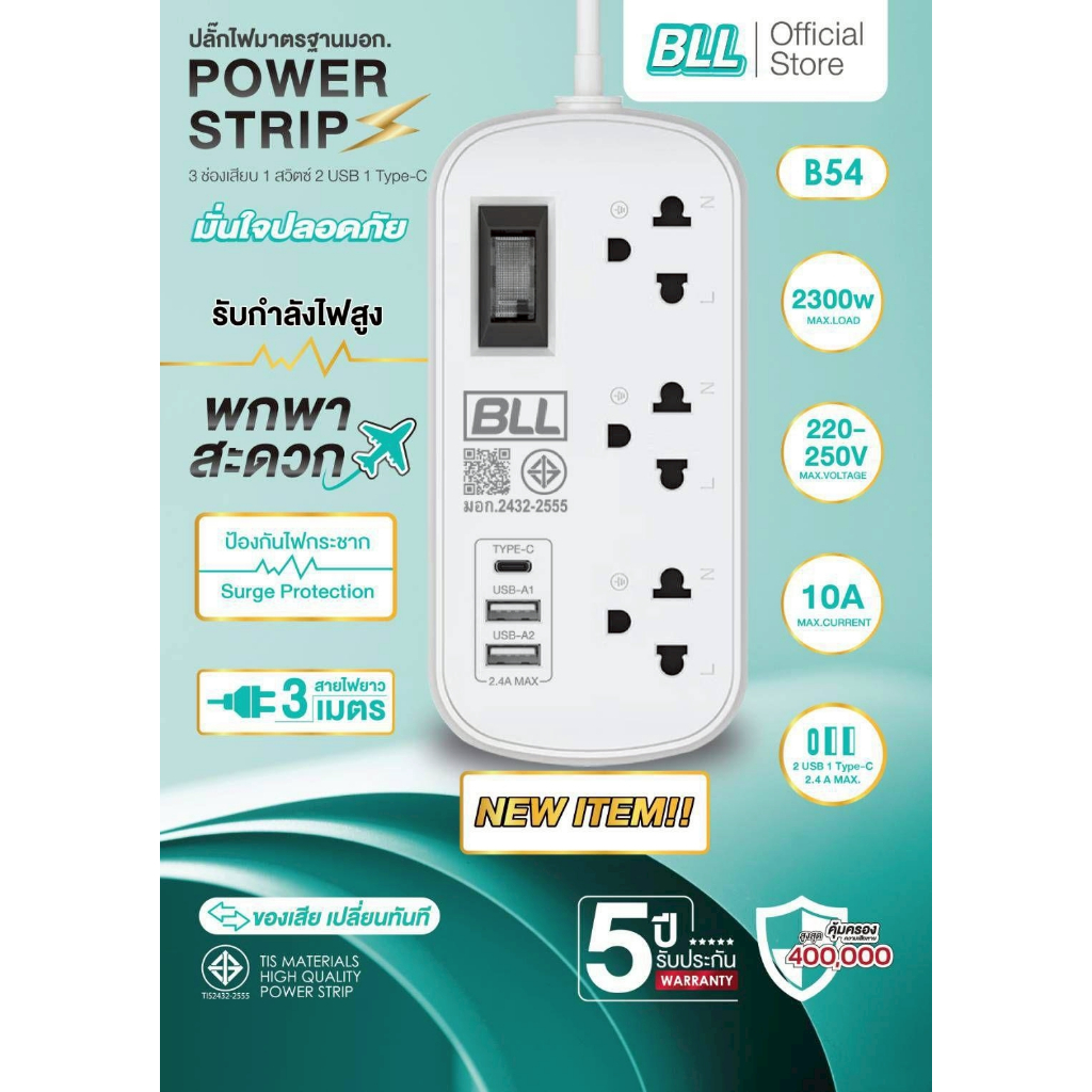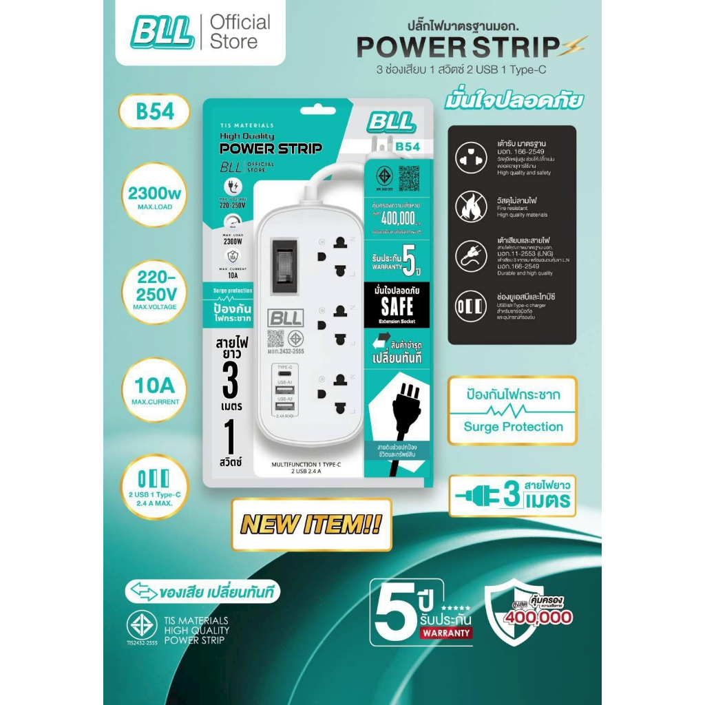 BLL B54 ปลั๊กไฟพกพา 3 ช่อง1สวิตซ์ 2USB 1Type-C สายยาว 3เมตร คุณภาพมาตรฐาน มอก. ประกัน 5ปี