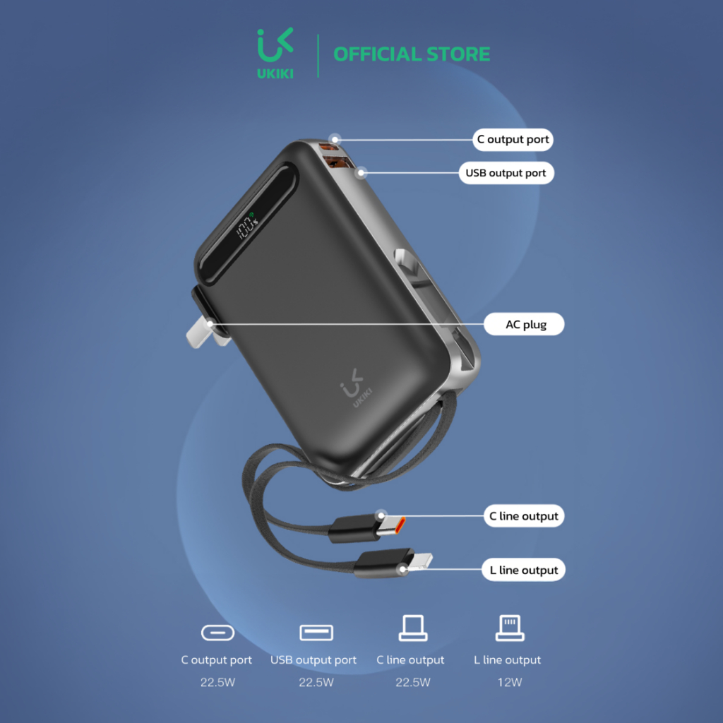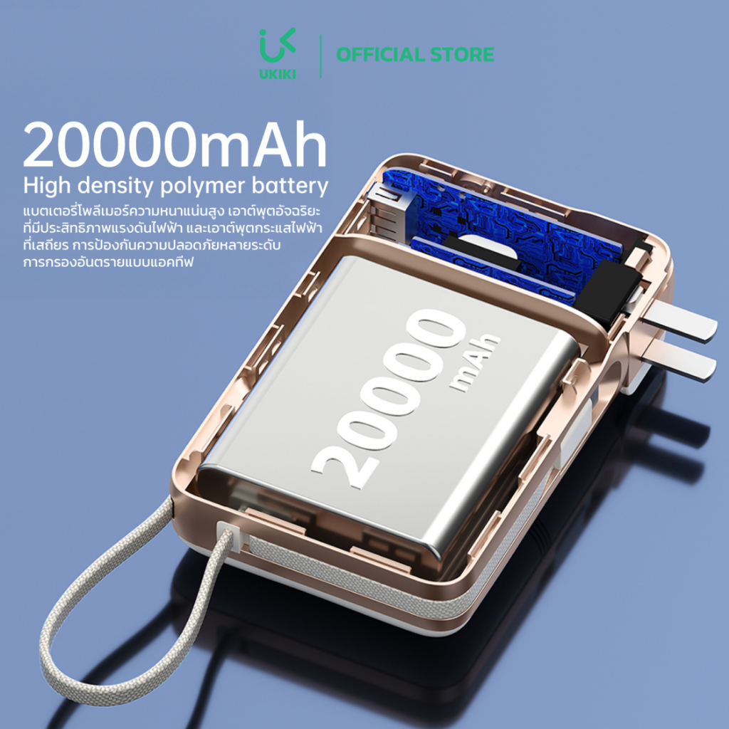 [CCC] UKIKI Powerbank 20000mAh ชาร์จเร็ว PD22.5W พาวเวอร์แบงค์ แบตสำรองมีขาปลั๊ก สายในตัว KP20AC-01