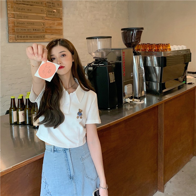 ZHELIHANGFEI หมีน้อยเสื้อยืดปักผู้หญิงพลิกคอเปิดสะดือเสื้อแขนสั้น