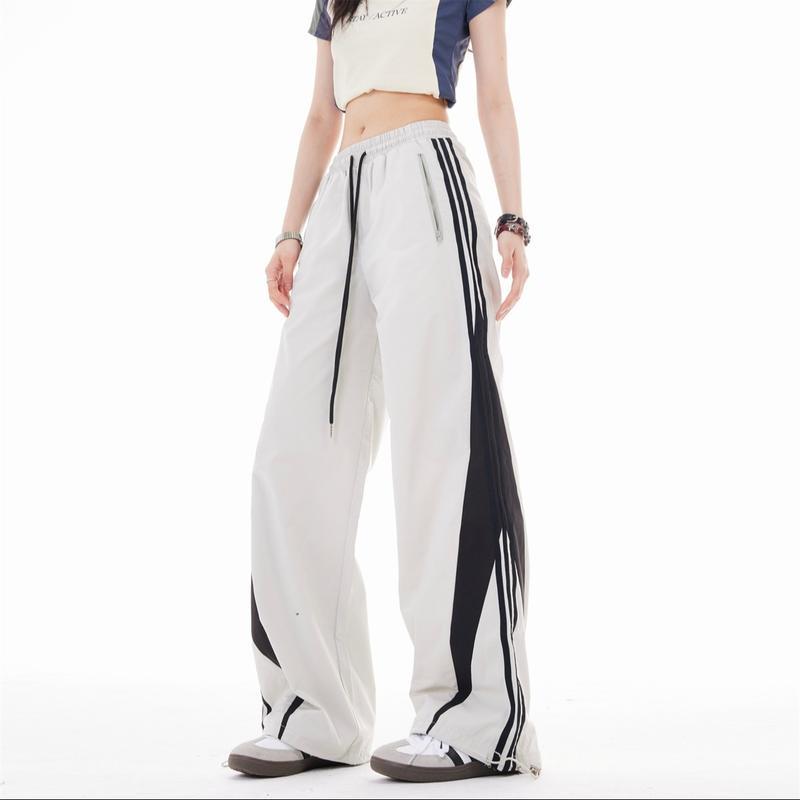 Fancy กางเกงขายาวทรงตรงลายทางย้อนยุค แห้งเร็ว กางเกงขายาวลำลองทรงหลวมแบบต่อลายขาวดำ M-3XL
