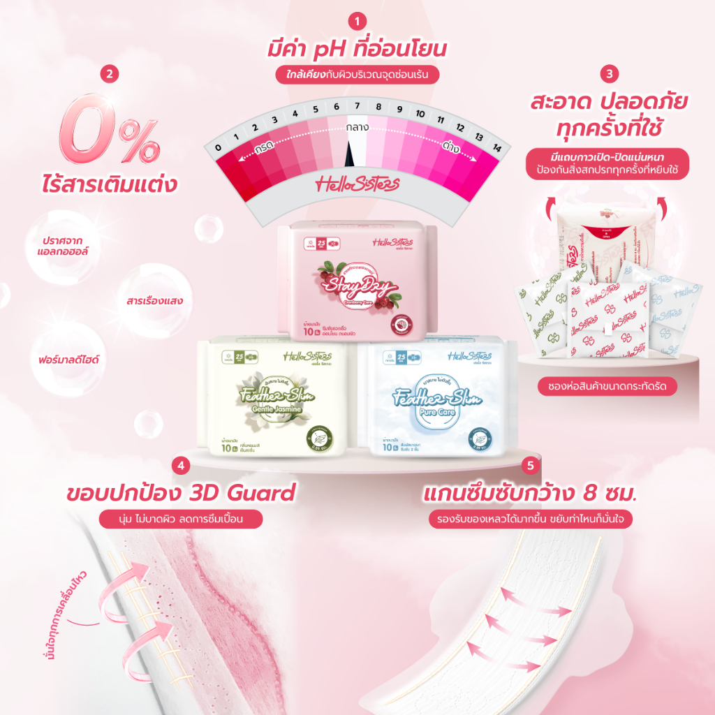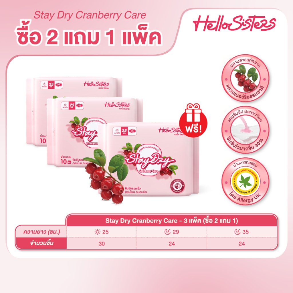 [เลือกความยาวเลย] 2 แถม 1 StayDry Cranberry Care HelloSisters เฮลโล ซิสเทอะ ผ้าอนามัย มีปีกและไม่มีปีก 25-35 ซม.