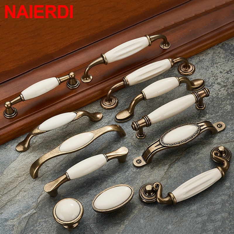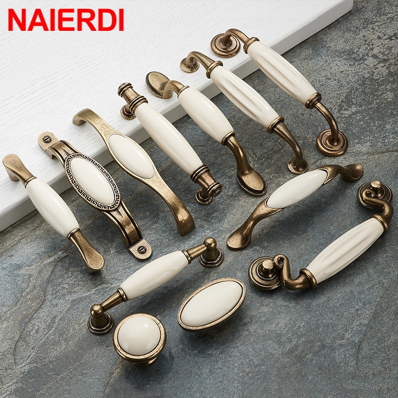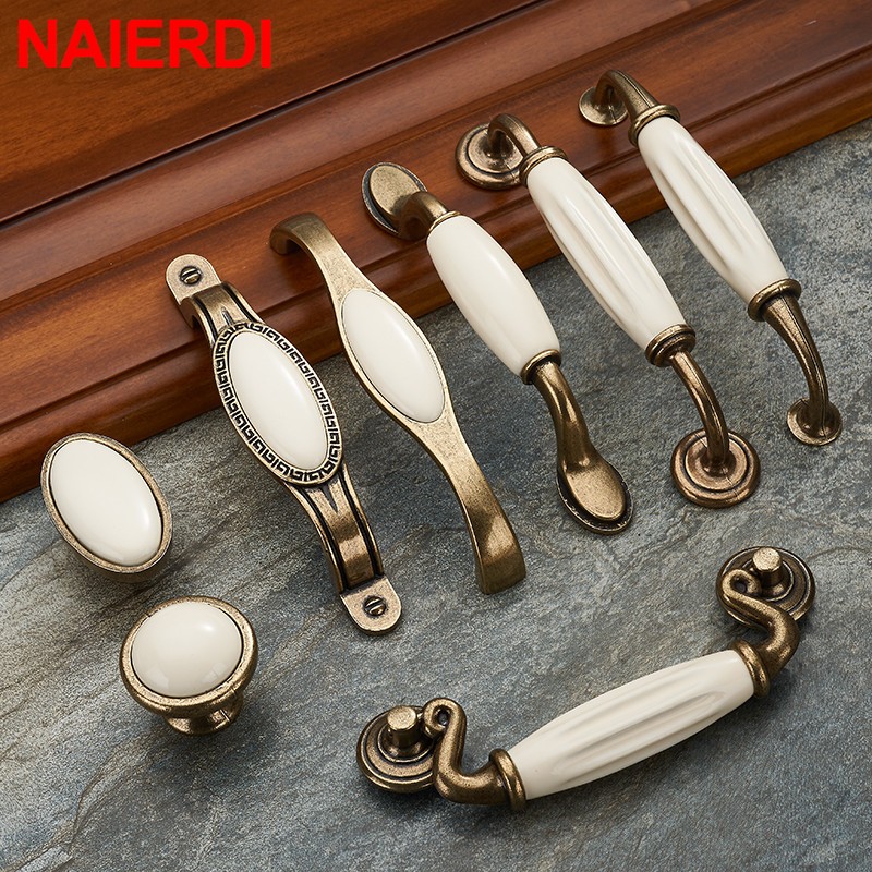 Naierdi โลหะผสมสังกะสีสําริดโบราณเซรามิกสีขาวตู้จับลิ้นชักลูกบิดยุโรปตู้เสื้อผ้ามือจับประตู