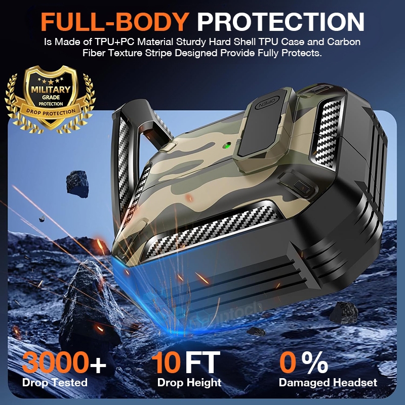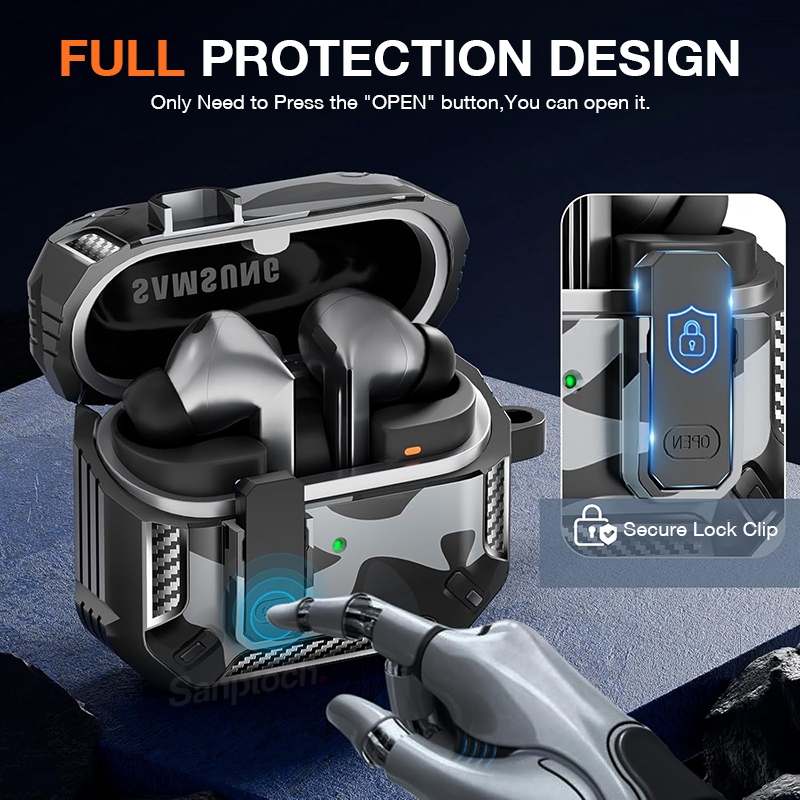 Sanptoch สําหรับ Samsung Galaxy Buds 3 & Buds 3 Pro Case พร้อมคลิปล็อคที่ปลอดภัยและชุดทําความสะอาดฝาครอบกันกระแทกแบบเต็มตัวสําหรับ Galaxy Buds 3 Pro ปลอกป้องกันลายพรางพร้อมเชือกเส้นเล็ก