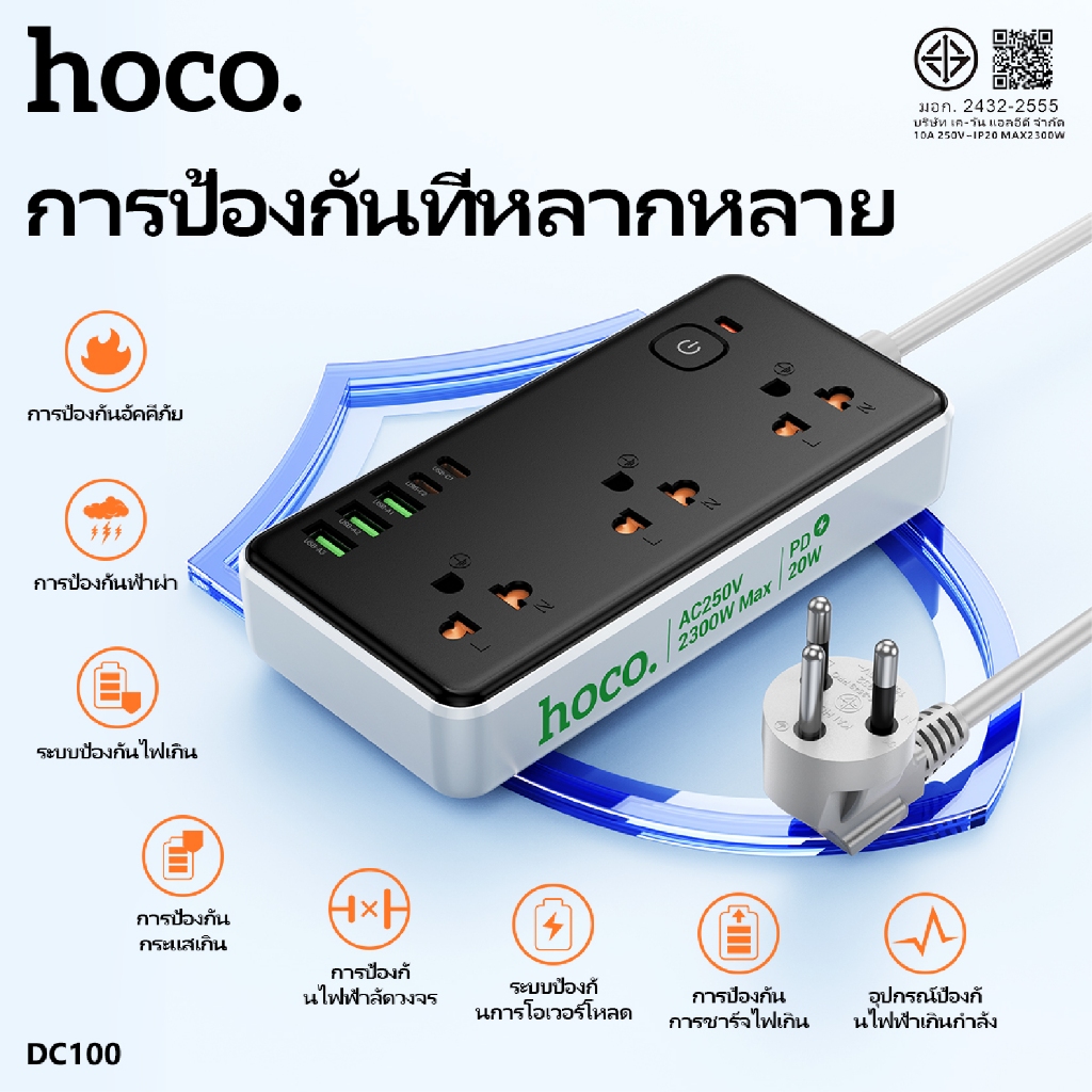 ปลั๊กพ่วงชาร์จเร็ว 8ช่องชาร์จ USB-A/USB-C/SOCKET สายยาว 2เมตร ขาปลั๊กกลม HOCO DC100