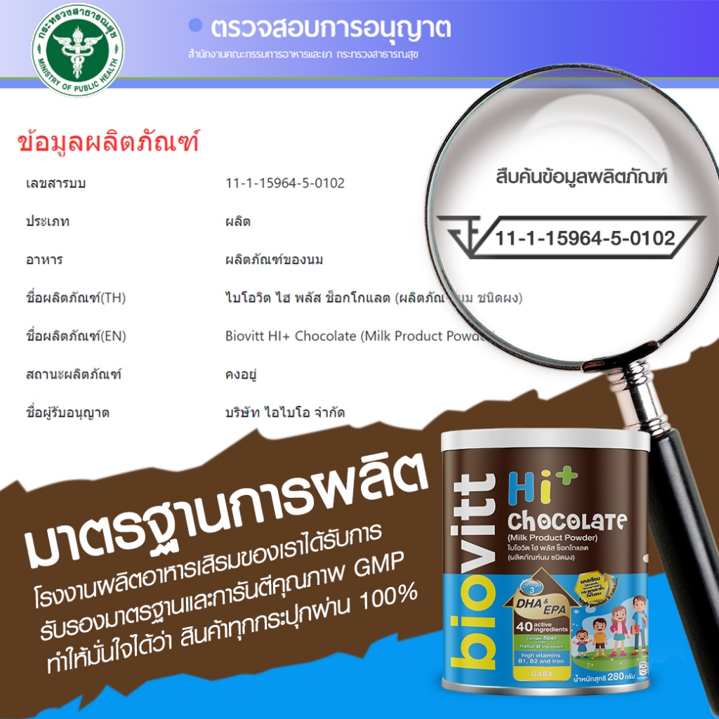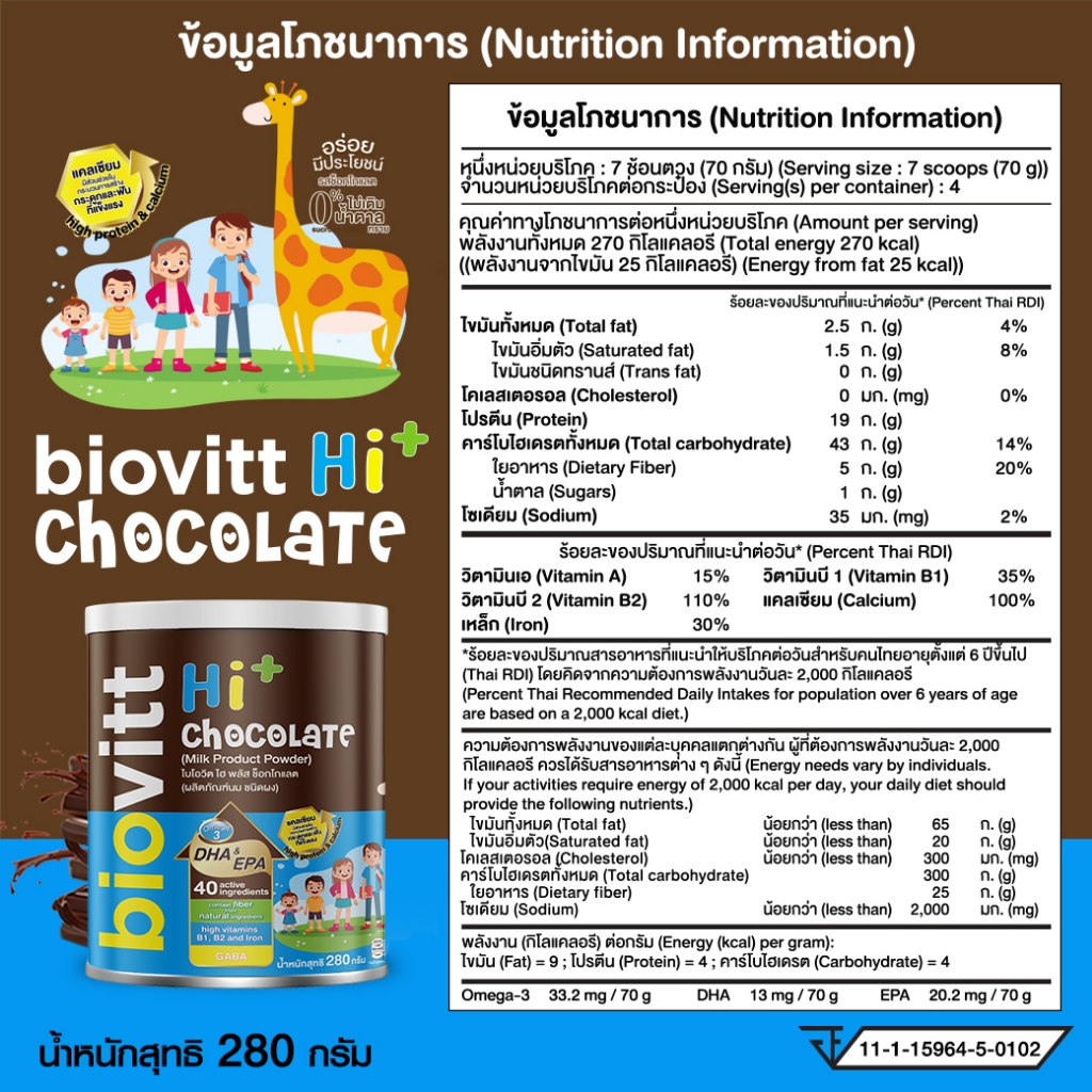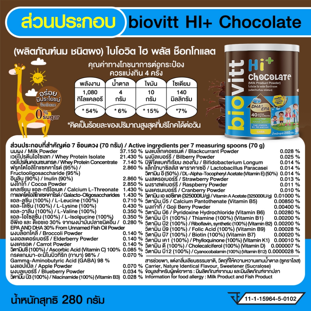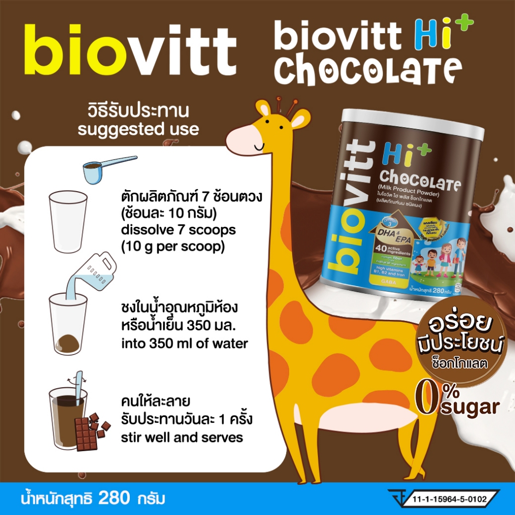 biovitt HI+ Chocolate ผลิตภัณฑ์เสริมอาหาร รสช็อกโกแลต มีแคลเซียม หอม อร่อย ชงง่าย | 280 กรัม