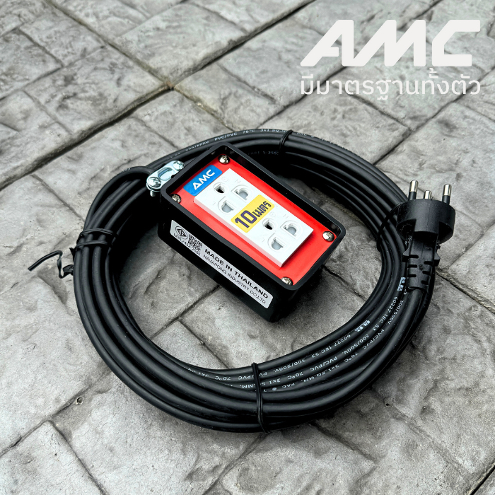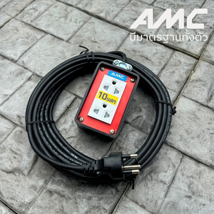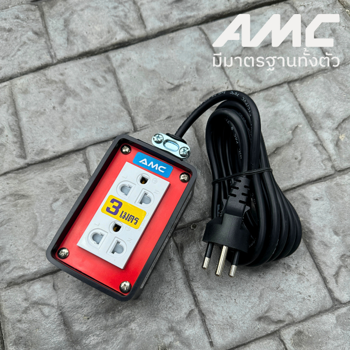 AMC ปลั๊กบล็อคยาง มาตราฐาน มอก. 2 ช่อง (หน้าพลาสติกแดง) ยาว 3-10 เมตร C02XXRD
