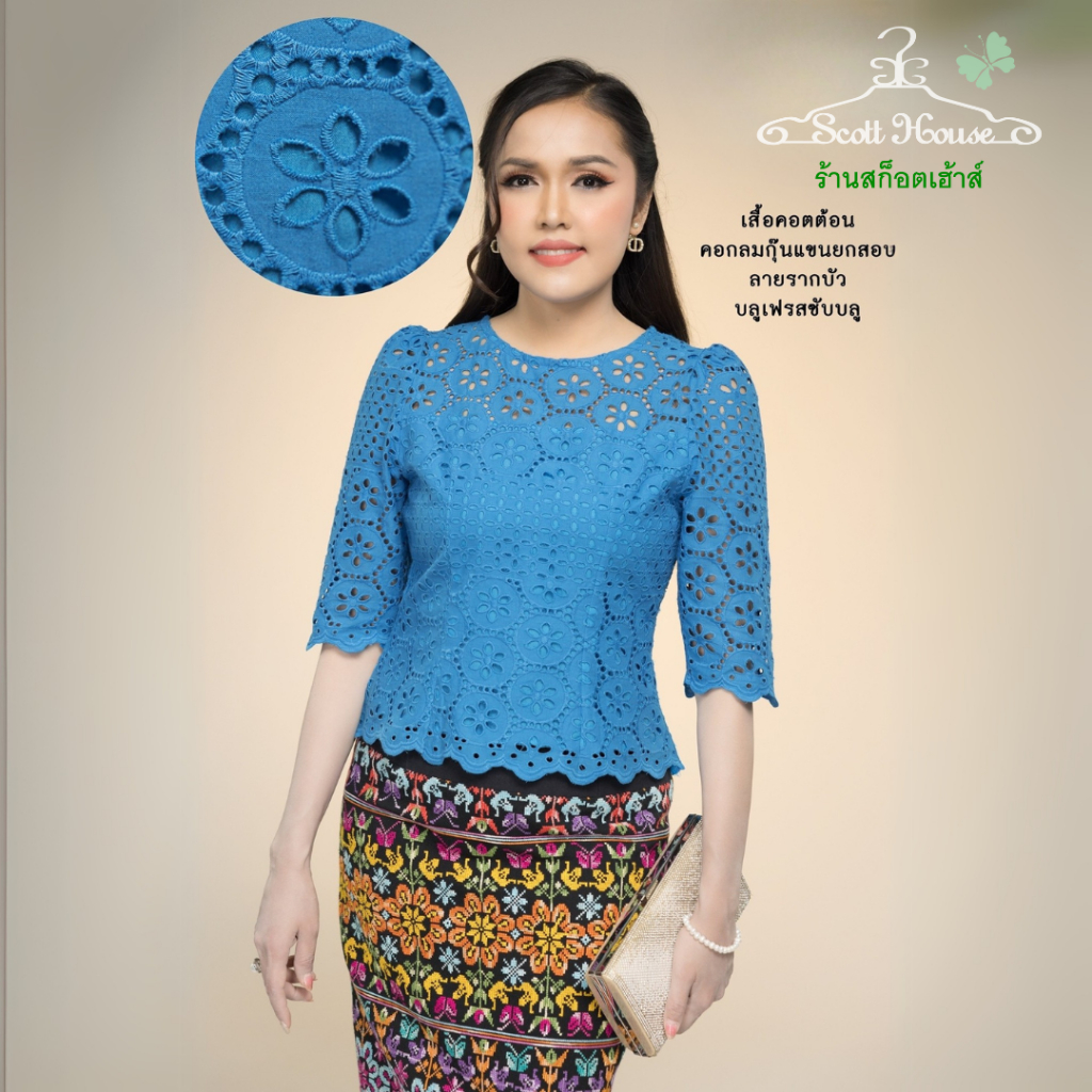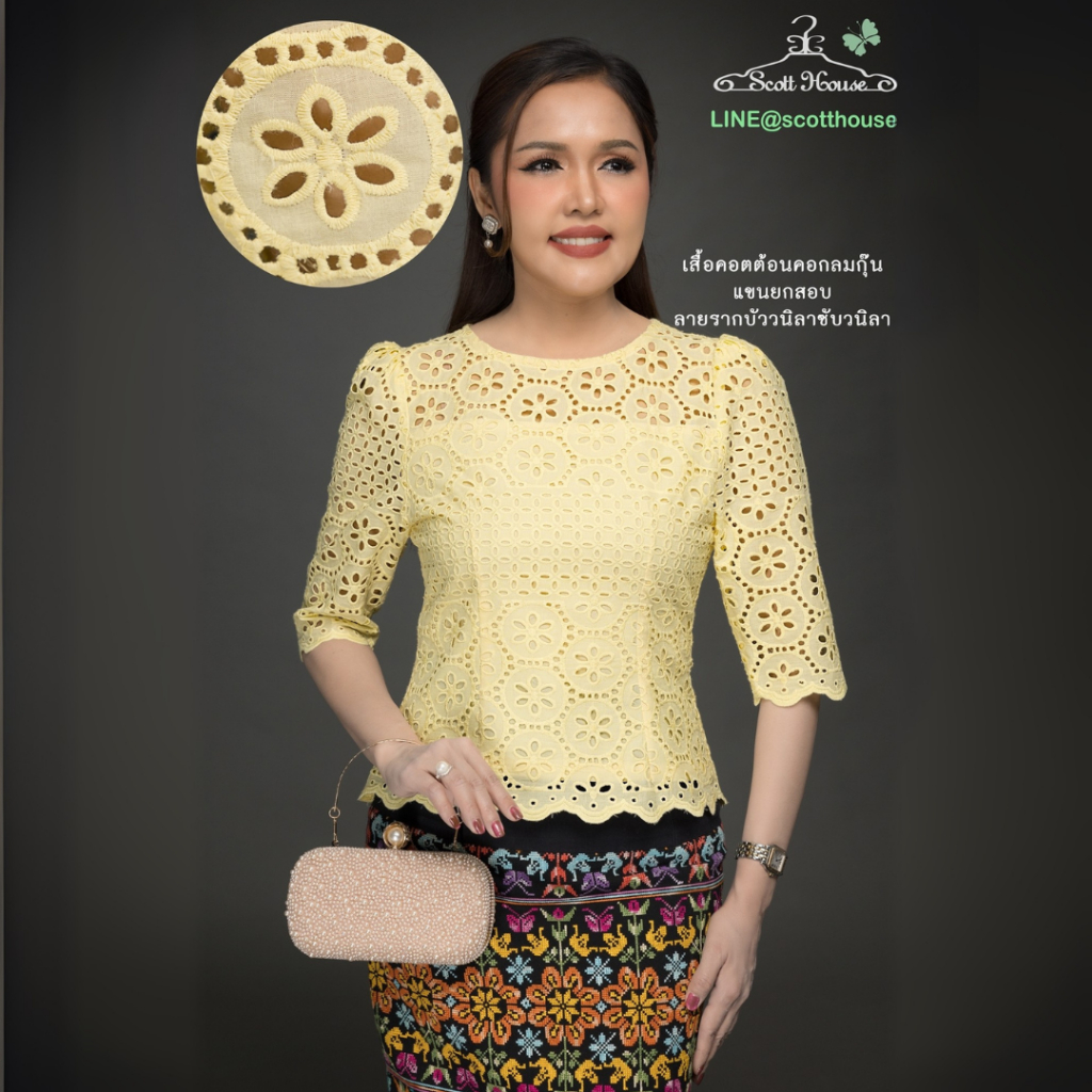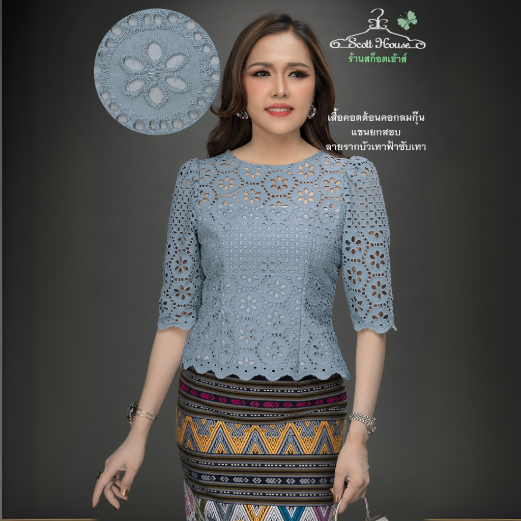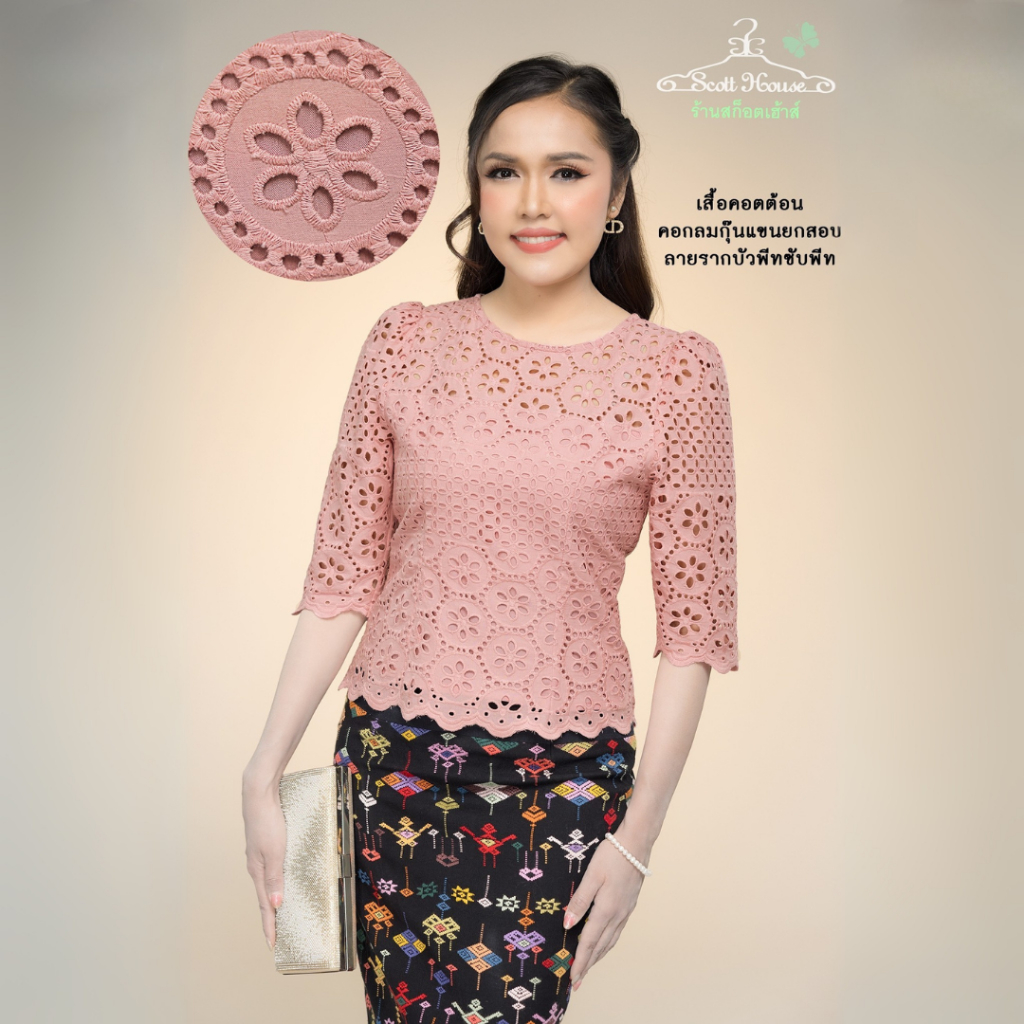 เสื้อคอตต้อนแท้100% รุ่นคอกลมกุ๊นแขนยกสอบ รวมลายปักฉลุ1