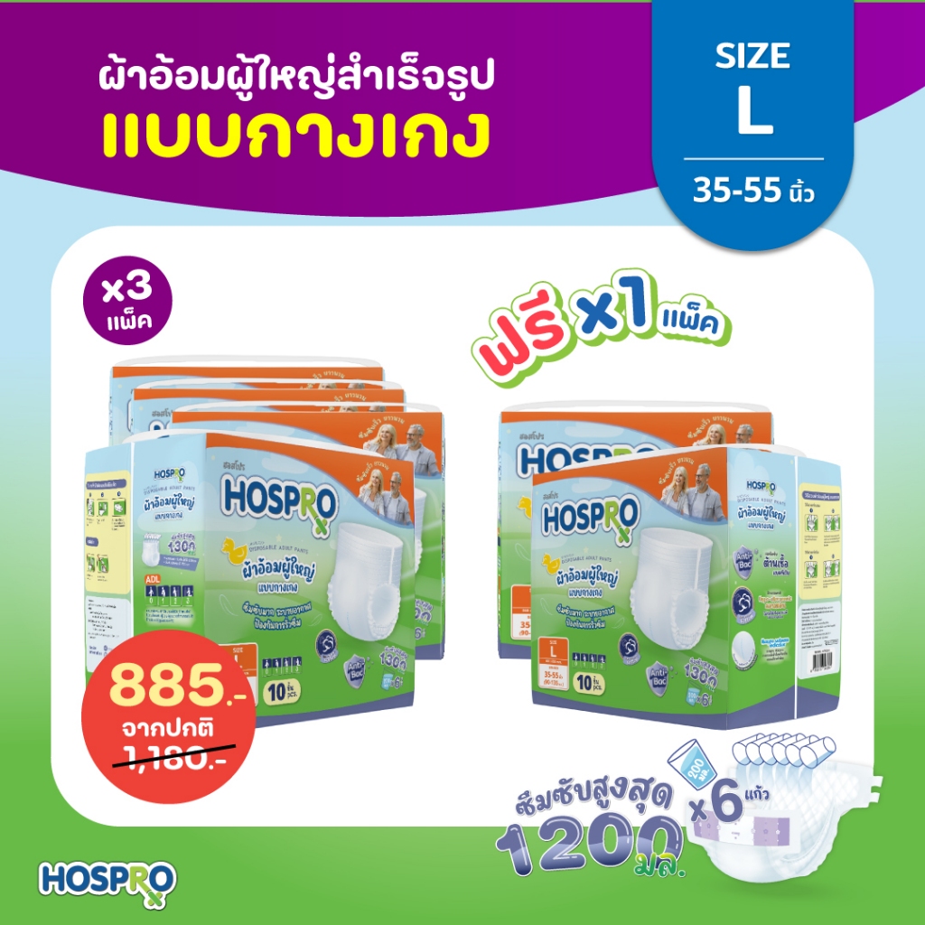 (พร้อมส่ง) 3 แถม 1 HOSPRO ผ้าอ้อมผู้ใหญ่ แบบกางเกง ซึมซับดี นุ่มสบาย ต้านเชื้อแบคทีเรีย แพ็ค 10 ชิ้น