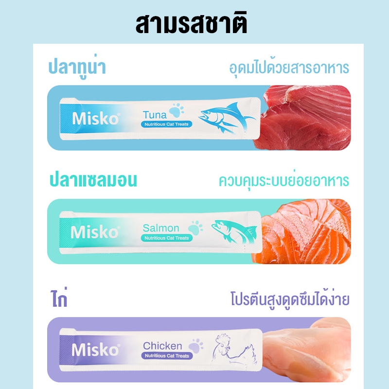 【10 แพ็ค】Misko สติ๊กแมว 15g ✨ขนสวยผิว 3 รสทูน่า/แซลมอน/ไก่ ช่วยย่อย✅ไม่มีสารกันบูด Cat Stick