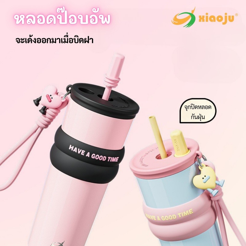 XIAOJU แก้วซับเซรามิกพร้อมเชือกหิ้ว 710ml หลอดป๊อบอัพเด้งเมื่อบิดฝา ซับในอีกชั้นด้วยสแตนเลส 316 เก็บอุณหภูมิร้อน&เย็น
