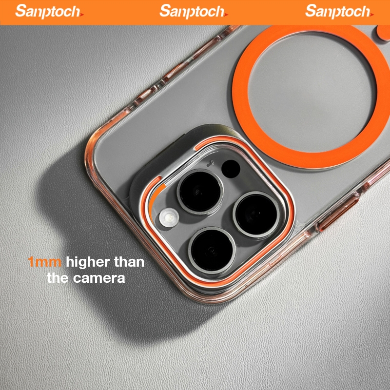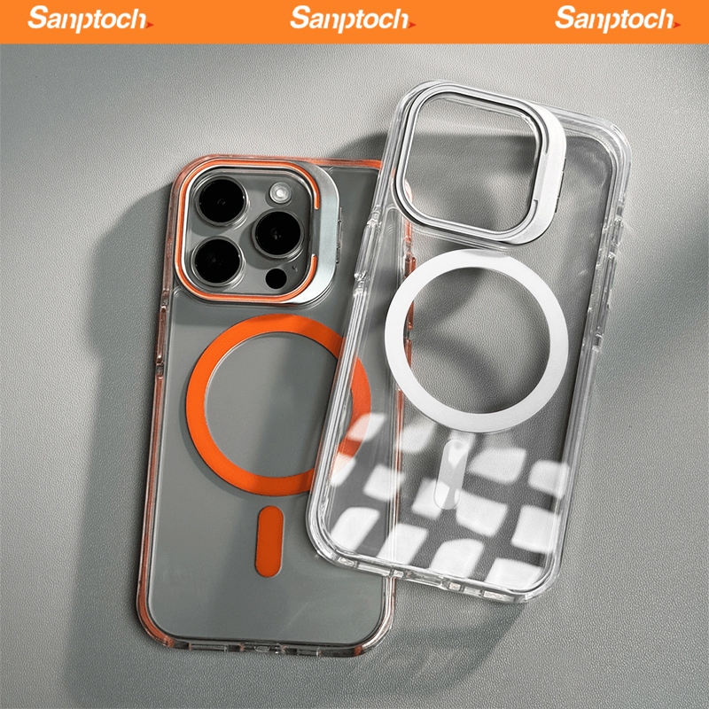 Sanptoch สําหรับแม่เหล็กที่มองไม่เห็นเลนส์ขาตั้งเคสโทรศัพท์สําหรับ iPhone 17 16 15 14 13 12 Pro Max กันกระแทกฝาครอบกันชนใสทหาร-drop ป้องกันปลอกพร้อมกล้องผู้ถือโลหะผสม
