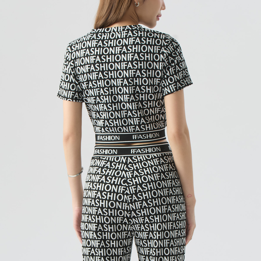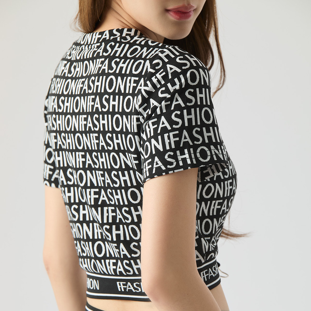 f.fashion เสื้อนิตทรงครอป ทอจาคการ์ด ผู้หญิง สีดำ-ขาว I Crop Knit Top in Knit Jacquard I 06501
