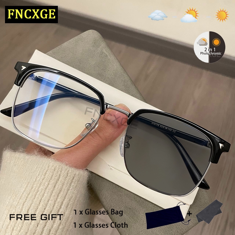 FNCXGE แว่นสายตาสั้น ยตาสั้นเลนส์ออโตเมติก ครึ่งเฟรม แว่นตาสายสั้น ป้องกันรังสี แฟชั่น สไตล์เกาหลี สไตล์วินเทจ ผู้ชาย ผู้หญิง