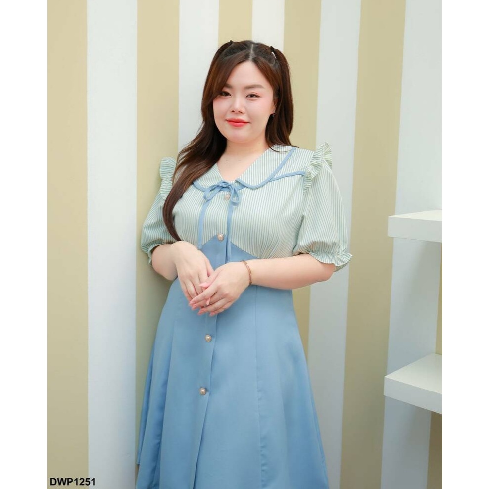 Big Size : 3XL-7XL | เดรสสั้นระบายไหล่ แขนจั้มอกแต่งกระดุม กระโปรงบานมีซับใน สีฟ้า P1251