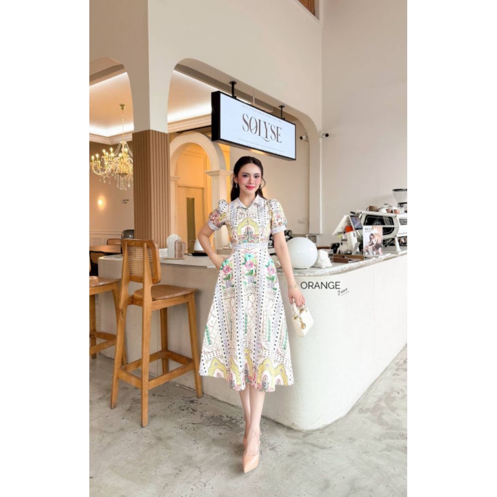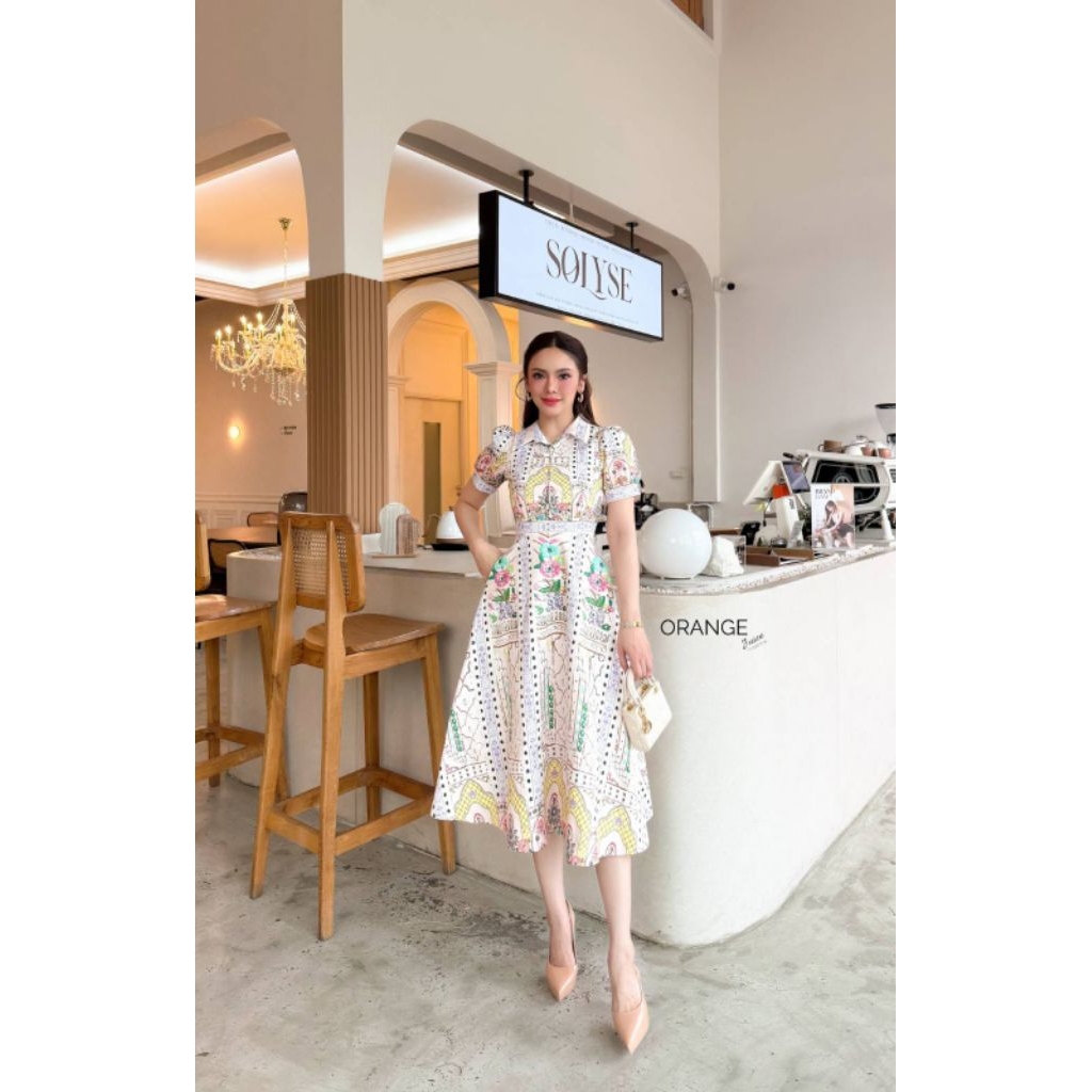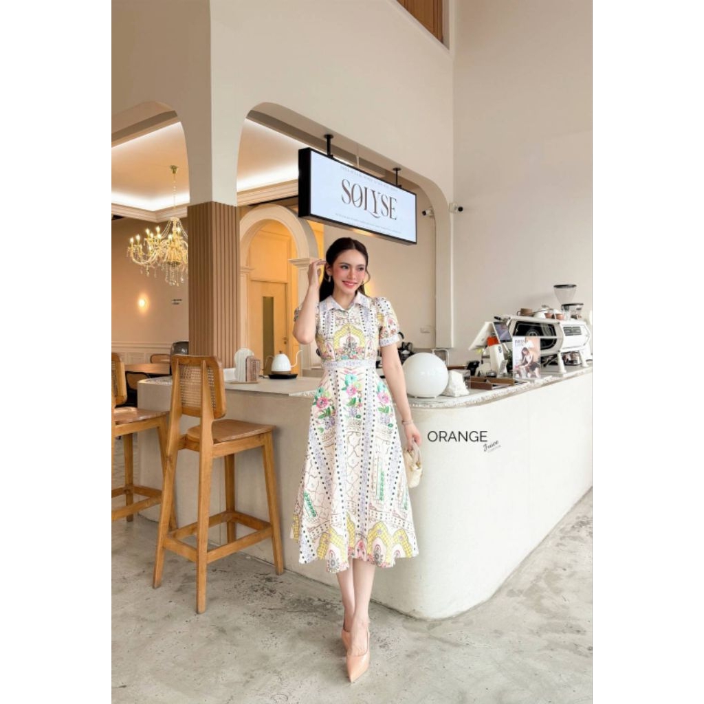 เดรสสีครีมสวยละมุน!!! S-5XL Maxi Dress เดรสแขนพองพิมพ์ลายดอกไม้กระดุมหน้า งานป้าย Orange Juice