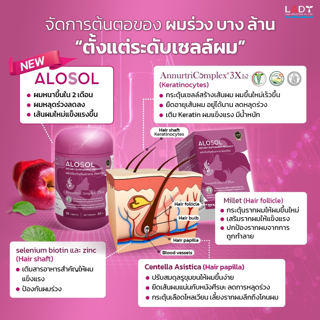 Alosol (อัลออโซล) คืนความหนาให้เส้นผมสำหรับผู้มีปัญหาผมบางจากฮอร์โมน ด้วยการบำรุงรากผมจากสารอาหารธรรมชาติ