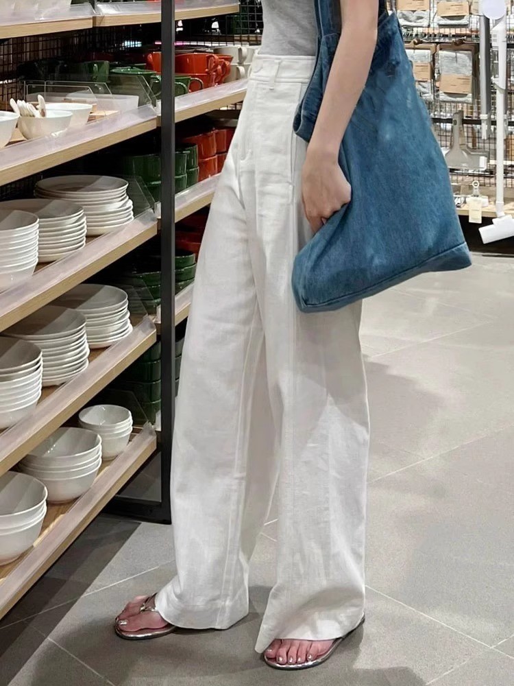 73321 เอวสูงผ ้ าฝ ้ ายสีขาวผ ้ าลินินกางเกงขากว ้ างตรงกางเกงลําลอง