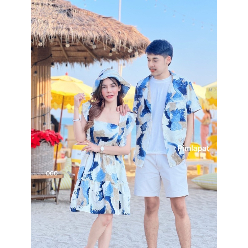 ชุดคู่ เซ็ต3ชิ้น เดรสคอเหลี่ยม ระบายช่วงแขนผูกหลังมาพร้อมหมวก+เสื้อฮาวายผู้ชาย ใส่ไปทะเล คือปัง