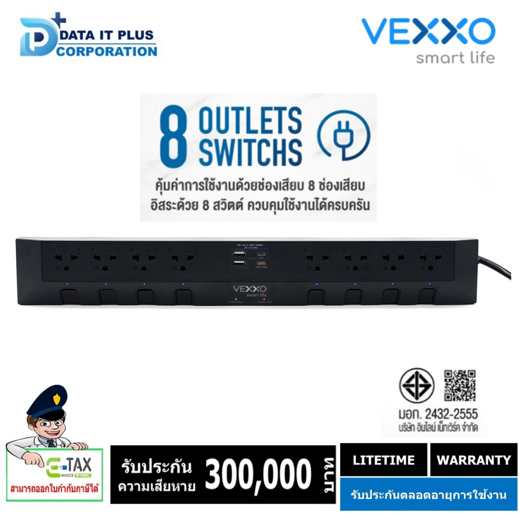 VEXXO Studio PowerStrip ปลั๊กไฟ มอก. VEXXO STUDIO POWERSTRIP ปลั๊กไฟ 8 สวิตช์ 8 ช่องเสียบ 2 USB + 1 TYPE-C