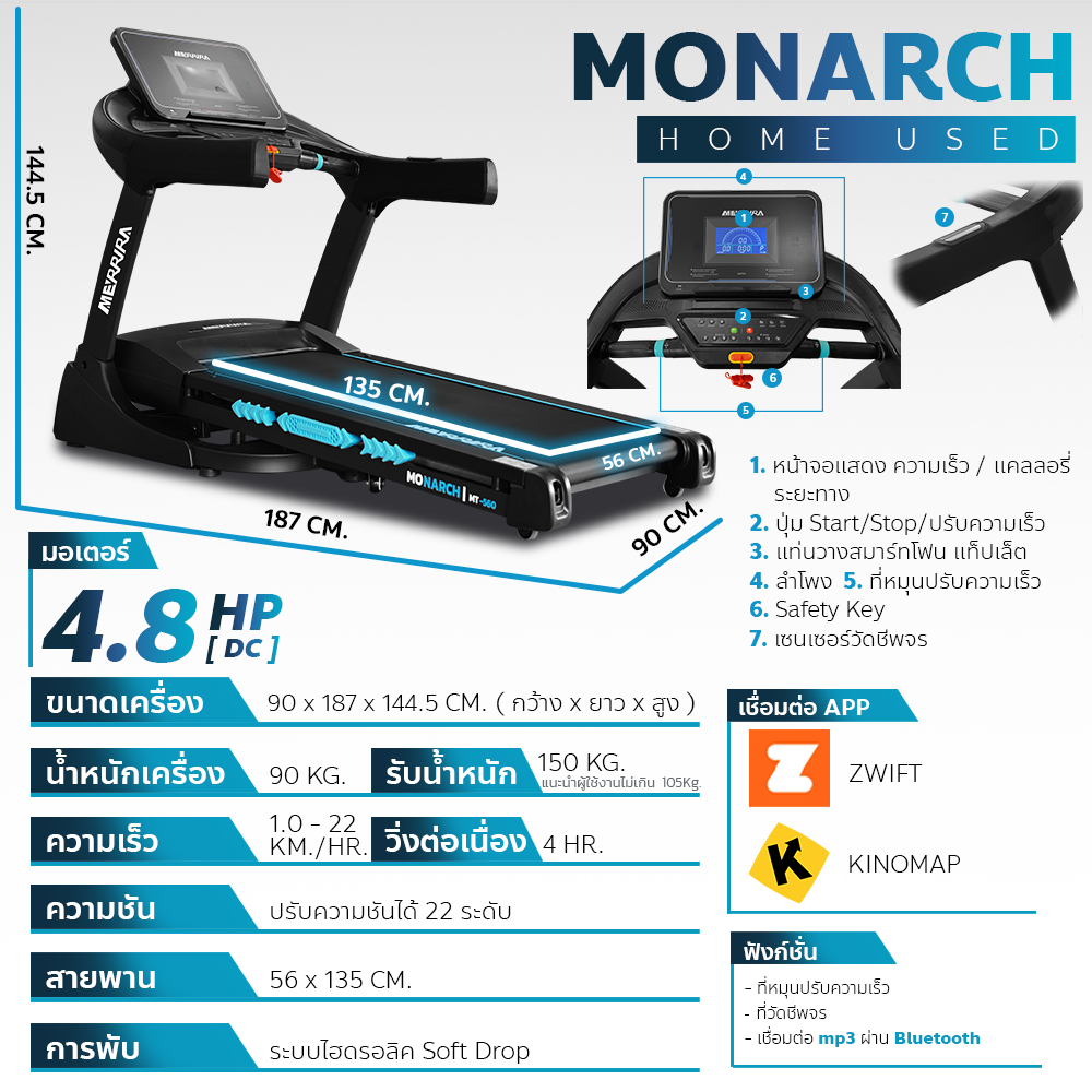 [ผ่อน0%10เดือน] MERRIRA ลู่วิ่งไฟฟ้า 4.8 แรงม้า รุ่น MT-560 สายพาน 56 ซม. เชื่อมต่อ ZWIFT ได้