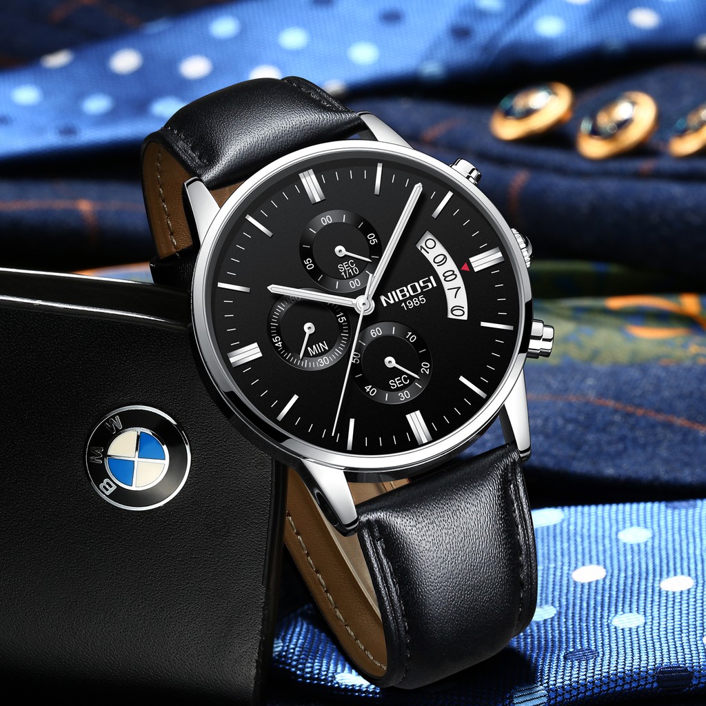 NIBOSI นาฬิกาผู้ชายชุดลำลองปฏิทินโครโนกราฟนาฬิกาข้อมือควอทซ์กันน้ำสำหรับผู้ชายที่มีสายหนัง