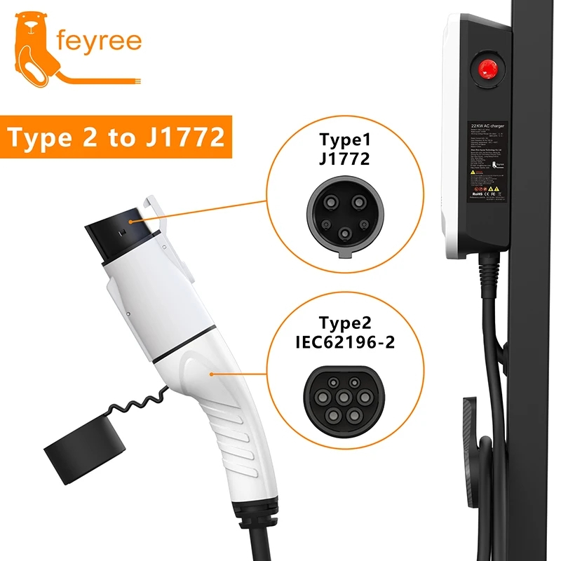 Feyree EV อะแดปเตอร์ชาร์จ Type2 IEC62196-2 ถึง Type1 รถชาร์จซ็อกเก็ต AC อะแดปเตอร์ชาร์จ 32A 1Phase 3.5KW 7KW Max รถยนต์ไฟฟ้า