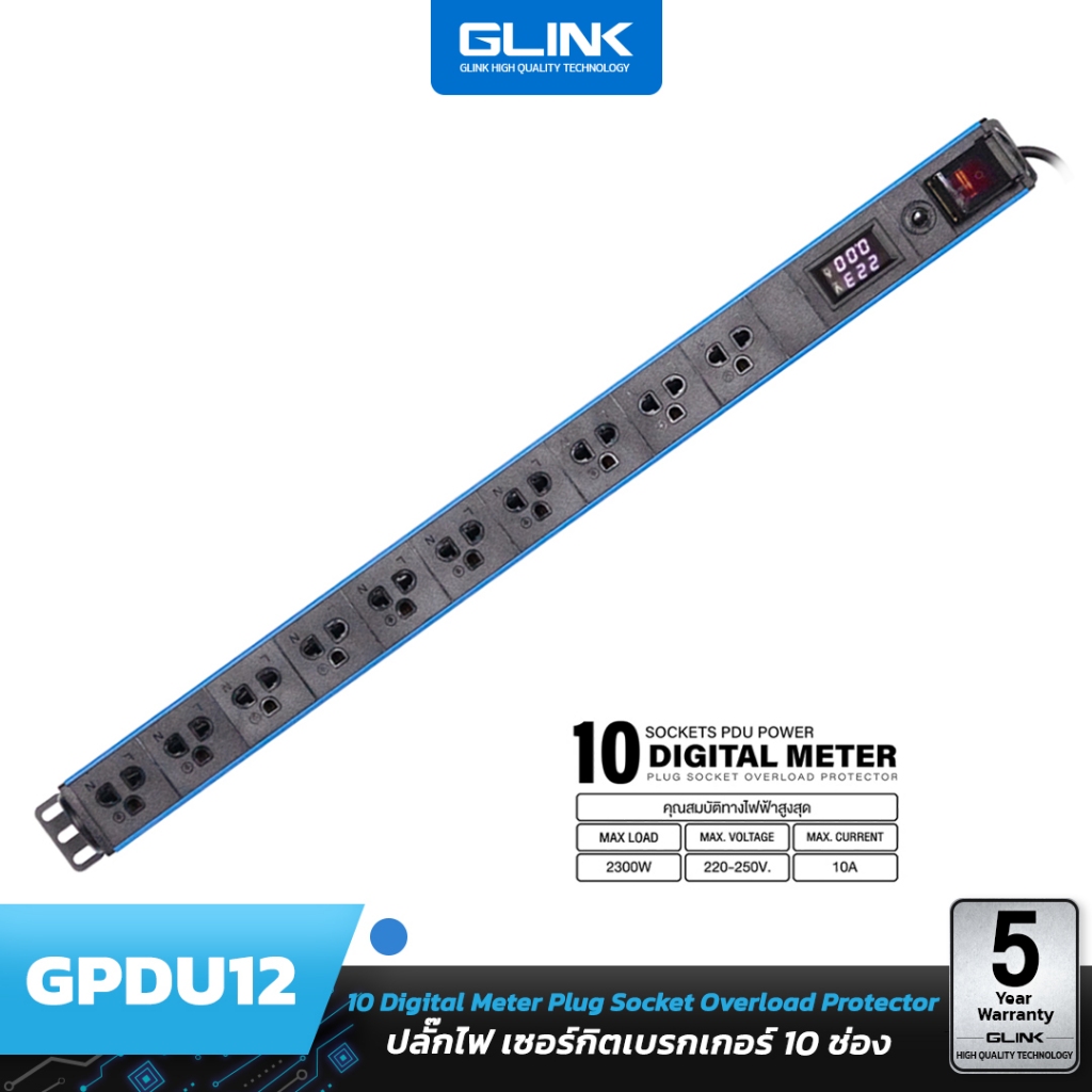 GLINK GPDU-12 ปลั๊กไฟ 10 ช่อง มีจอ LCD+overload 10A (สาย 2m)